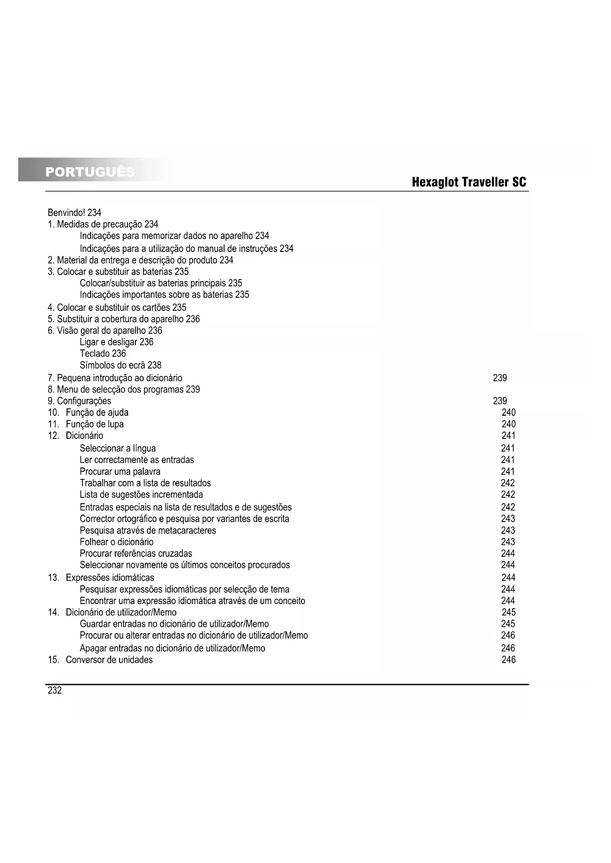 PORTUGUÊS Benvindo! Muito obrigado por ter escolhido o Hexaglot Traveller SC. Por favor, reserve alguns minutos para a leitura cuidada e integral deste manual de instruções, antes da primeira utilização, para que possa usufruir de todas as funções deste aparelho durante muitos anos. Por favor, conserve este manual de instruções de forma adequada, de forma a permitir-lhe consultas posteriores. A Hexaglot deseja-lhe muito sucesso na utilização do seu Hexaglot Traveller SC!