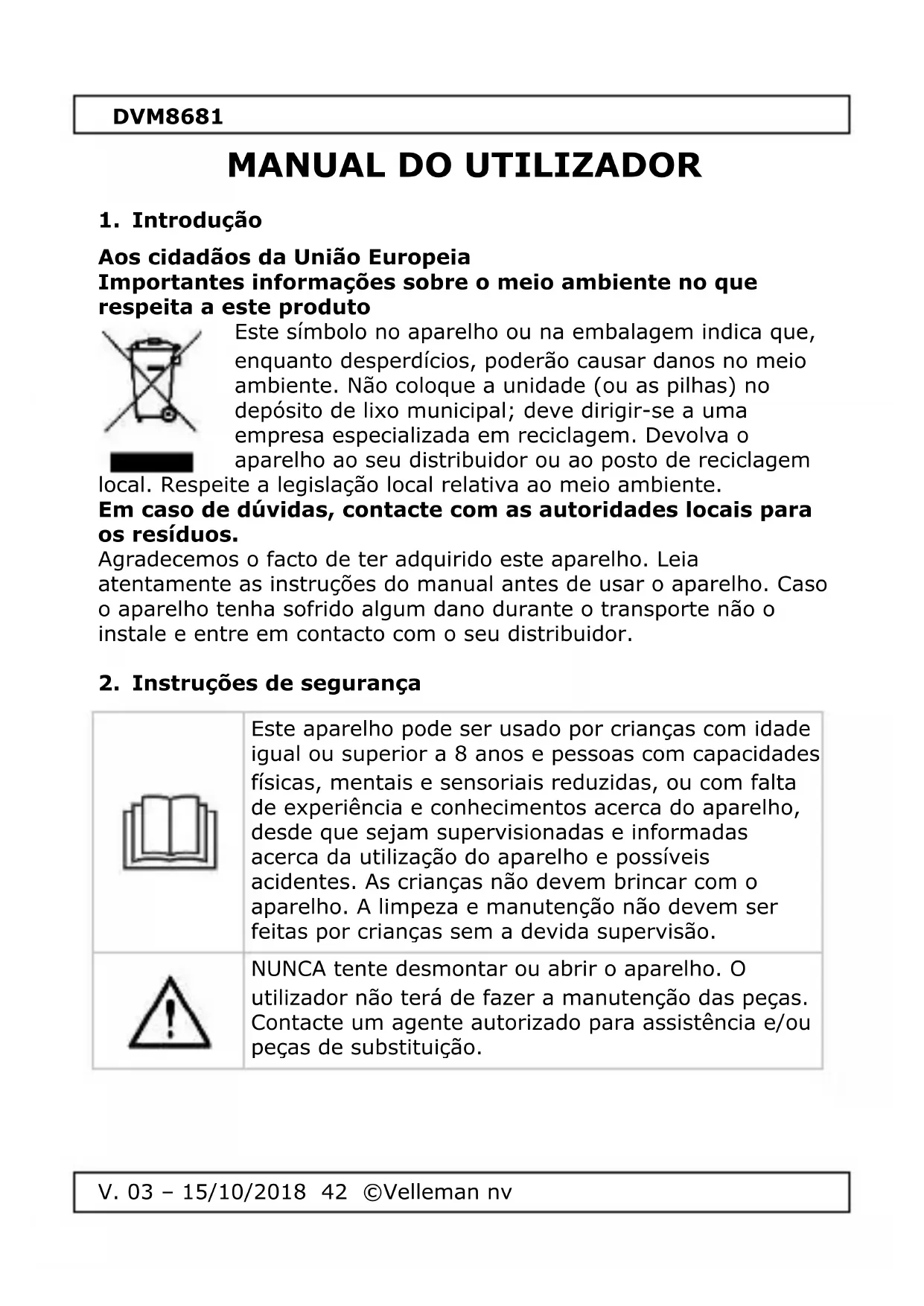 Encontre gratuitamente o manual do aparelho DVM8681 VELLEMAN em formato PDF.