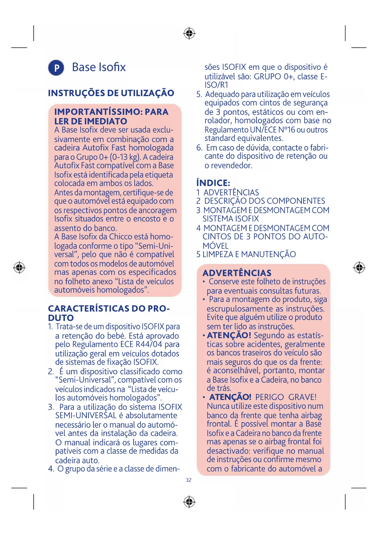- O risco de sérios danos para o bebé, não só em caso de acidente, mas também noutras circunstâncias (por ex. travagens bruscas, etc.), aumenta se as indicações descritas neste manual não forem respei- tadas de modo rigoroso: verifique sempre se a Base Isofix e a Cadei- ra estão correctamente fixas ao banco.