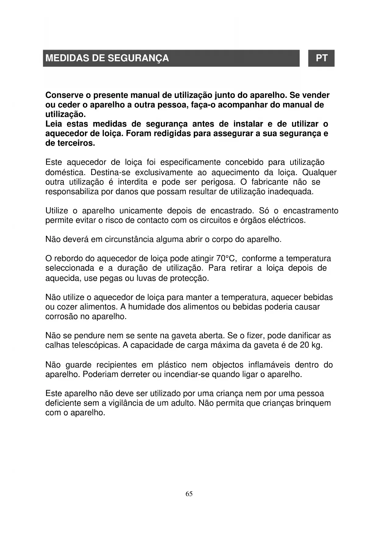 Conserve o presente manual de utilização junto do aparelho. Se vender ou ceder o aparelho a outra pessoa, faça-o acompanhar do manual de utilização. Leia estas medidas de segurança antes de instalar e de utilizar o aquecedor de loiça. Foram redigidas para assegurar a sua segurança e de terceiros. Este aquecedor de loiça foi especificamente concebido para utilização doméstica. Destina-se exclusivamente ao aquecimento da loiça. Qualquer outra utilização é interdita e pode ser perigosa. O fabricante não se responsabiliza por danos que possam resultar de utilização inadequada. Utilize o aparelho unicamente depois de encastrado. Só o encastramento permite evitar o risco de contacto com os circuitos e órgãos eléctricos. Não deverá em circunstância alguma abrir o corpo do aparelho. O rebordo do aquecedor de loiça pode atingir 70°C, conforme a temperatura seleccionada e a duração de utilização. Para retirar a loiça depois de aquecida, use pegas ou luvas de protecção. Não utilize o aquecedor de loiça para manter a temperatura, aquecer bebidas ou cozer alimentos. A humidade dos alimentos ou bebidas poderia causar corrosão no aparelho. Não se pendure nem se sente na gaveta aberta. Se o fizer, pode danificar as calhas telescópicas. A capacidade de carga máxima da gaveta é de 20 kg. Não guarde recipientes em plástico nem objectos inflamáveis dentro do aparelho. Poderiam derreter ou incendiar-se quando ligar o aparelho. Este aparelho não deve ser utilizado por uma criança nem por uma pessoa deficiente sem a vigilância de um adulto. Não permita que crianças brinquem com o aparelho.66
