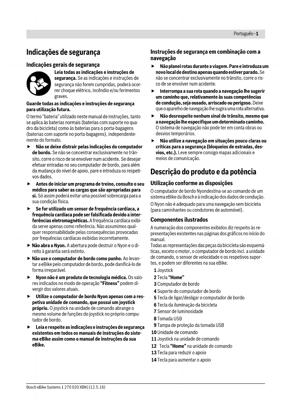 Erro na versão de software Entre em contacto com o seu agente autorizado eBike da Bosch, para que efetue uma atualização do software. 7xx Erro da transmissão Respeite o manual de instruções do fabricante da transmissão. Nenhuma indicação Erro interno do computador de bordo Reinicie o sistema eBike, desligando e ligando. Código Causa SoluçãoPortuguês–12 1 270 020 XBN | (12.5.16) Bosch eBike Systems Abastecimento de energia de aparelhos externos através da ligação USB Com ajuda da conexão USB é possível operar e carregar a maioria dos aparelhos que podem ser alimentados com ener- gia através de USB (p.ex. diversos telefones móveis). O pré-requisito para o carregamento é que estejam montados na eBike o computador de bordo e uma bateria com carga suficiente. Abra a tampa de proteção 9 da ligação USB no computador de bordo. Conecte a ligação USB do aparelho externo à tomada USB 8 do computador de bordo através de um cabo USB de carregamento micro A–micro B (disponível junto do seu agente autorizado eBike da Bosch). Depois de desligado o consumidor, a ligação USB tem de ser novamente fechada cuidadosamente com a tampa de prote- ção 9. Uma conexão USB não é uma ligação de encaixe à prova de água. Nos trajetos com chuva, não pode ficar conecta- do qualquer aparelho externo e a ligação USB tem de es- tar completamente fechada com a tampa de proteção 9. Atenção: Os consumidores ligados ao Nyon podem reduzir a autonomia da eBike. Indicações para conduzir com o sistema eBike Manuseamento cuidado da eBike Respeite as temperaturas de funcionamento e de armazena- mento dos componentes da eBike. Proteja o motor, o compu- tador de bordo e a bateria de temperaturas extremas (p. ex. de uma radiação solar intensa sem ventilação em simultâ- neo). Os componentes (especialmente a bateria) podem ficar danificados devido a temperaturas extremas. Mantenha o ecrã do Nyon limpo. Se estiver sujo, a deteção da luminosidade pode funcionar incorretamente. No modo de navegação, a mudança dia/noite pode ser errónea. Se ocorrer uma mudança abrupta das condições ambientais, pode suceder que o vidro fique embaciado na parte de den- tro. Passado pouco tempo ocorre uma compensação da tem- peratura e o embaciamento desaparece. Manutenção e serviço Manutenção e limpeza Todos os componentes, incluindo o motor, não podem ser mergulhados em água nem limpos com água sob pressão. Para a limpeza do seu computador de bordo use apenas um pano humedecido com água. Não utilize produtos de limpeza. Mande efetuar uma inspeção técnica pelo menos uma vez por ano no seu sistema eBike (entre outras, sistema mecânico, atualidade do software do sistema). O fabricante de bicicletas ou o agente autorizado pode adicio- nalmente basear a data de serviço numa determinada quilo- metragem e/ou período de tempo. Neste caso, após cada liga- ção, o computador de bordo vai indicar a validade da data de serviço durante 4 s. Para assistência técnica e reparações na eBike contacte um agente autorizado. Todas as reparações devem ser executadas exclusiva- mente por um agente autorizado. Serviço pós-venda e consultoria de aplicação Se tiver questões sobre o sistema eBike e respetivos compo- nentes, contacte um agente autorizado. Pode consultar os dados de contacto de agentes autorizados na página de Internet www.bosch-ebike.com Transporte Se transportar a eBike fora do automóvel, p. ex. no res- petivo porta-bagagens, remova o computador de bordo e o PowerPack para evitar danos. Eliminação O motor, o computador de bordo, incl. a unidade de comando, a bateria, o sensor de velocidade, os aces- sórios e a embalagem devem ser reciclados de forma ambientalmente correta. Não deite a eBike e respetivos componentes para o lixo doméstico! Apenas países da União Europeia: Conforme as Diretivas Europeias 2012/19/UE relativa aos resíduos de aparelhos elétricas eu- ropeias 2006/66/CE é necessário recolher se- paradamente os acumuladores/as pilhas defei- tuosos ou gastos e conduzi-los a uma reciclagem ecológica. A bateria integrada no computador de bordo só pode ser reti- rada para efeitos de eliminação. O computador de bordo po- de ficar danificado se a tampa da carcaça for aberta. Entregue as baterias e o computador de bordo inutilizáveis a um agente autorizado. Lítio: Observe as indicações na secção “Transporte”, página Português–12. Sob reserva de alterações.Italiano–1 Bosch eBike Systems 1 270 020 XBN | (12.5.16) Norme di sicurezza Indicazioni generali di sicurezza Leggere tutte le avvertenze di sicurezza e le istruzioni. Eventuali omissioni nell’adempi- mento delle istruzioni e indicazioni sulla sicu- rezza potranno causare scosse elettriche, in- cendi e/o lesioni gravi. Conservare tutte le avvertenze di sicurezza e le istruzioni per ogni esigenza futura. Il termine «batteria» utilizzato nelle presenti istruzioni d’uso si riferisce, indipendentemente dalla forma costruttiva, in ugual misura alle batterie di tipo standard (batterie con supporto sul telaio della bicicletta) e a quelle a portapacchi (batterie con supporto nel portapacchi). Non lasciatevi distrarre dal display del computer di bor- do. Se non vi concentrate esclusivamente sul traffico, ri- schiate di essere coinvolti in un incidente. Se desiderate effettuare impostazioni sul computer di bordo relative alla modifica del livello di assistenza, fermatevi ed inserite i da- ti specifici. Prima di iniziare un programma di allenamento, consul- tare un medico per conoscere quali sforzi potete sop- portare. Solo così eviterete un possibile sforzo eccessivo per Voi. In caso di impiego di un sensore della frequenza cardia- ca, la frequenza visualizzata può essere falsata da di- sturbi elettromagnetici. Le frequenze cardiache visualiz- zate fungono solo da riferimento. Per eventuali conseguenze dovute a frequenze cardiache non visualizza- te correttamente, decliniamo ogni re