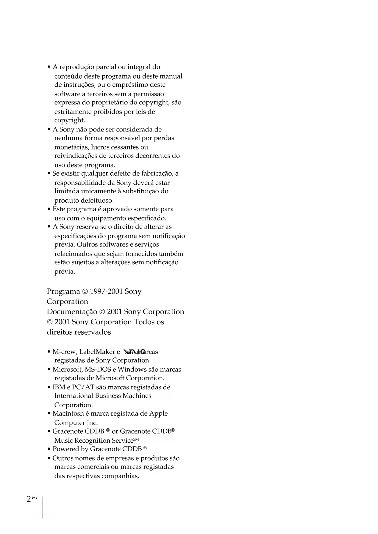 - A Sony reserva-se o direito de alterar as especificações do programa sem notificação prévia. Outros softwares e serviços relacionados que sejam fornecidos também estão sujeitos a alterações sem notificação prévia. Programa 1997-2001 Sony Corporation Documentação 2001 Sony Corporation 2001 Sony Corporation Todos os direitos reservados.