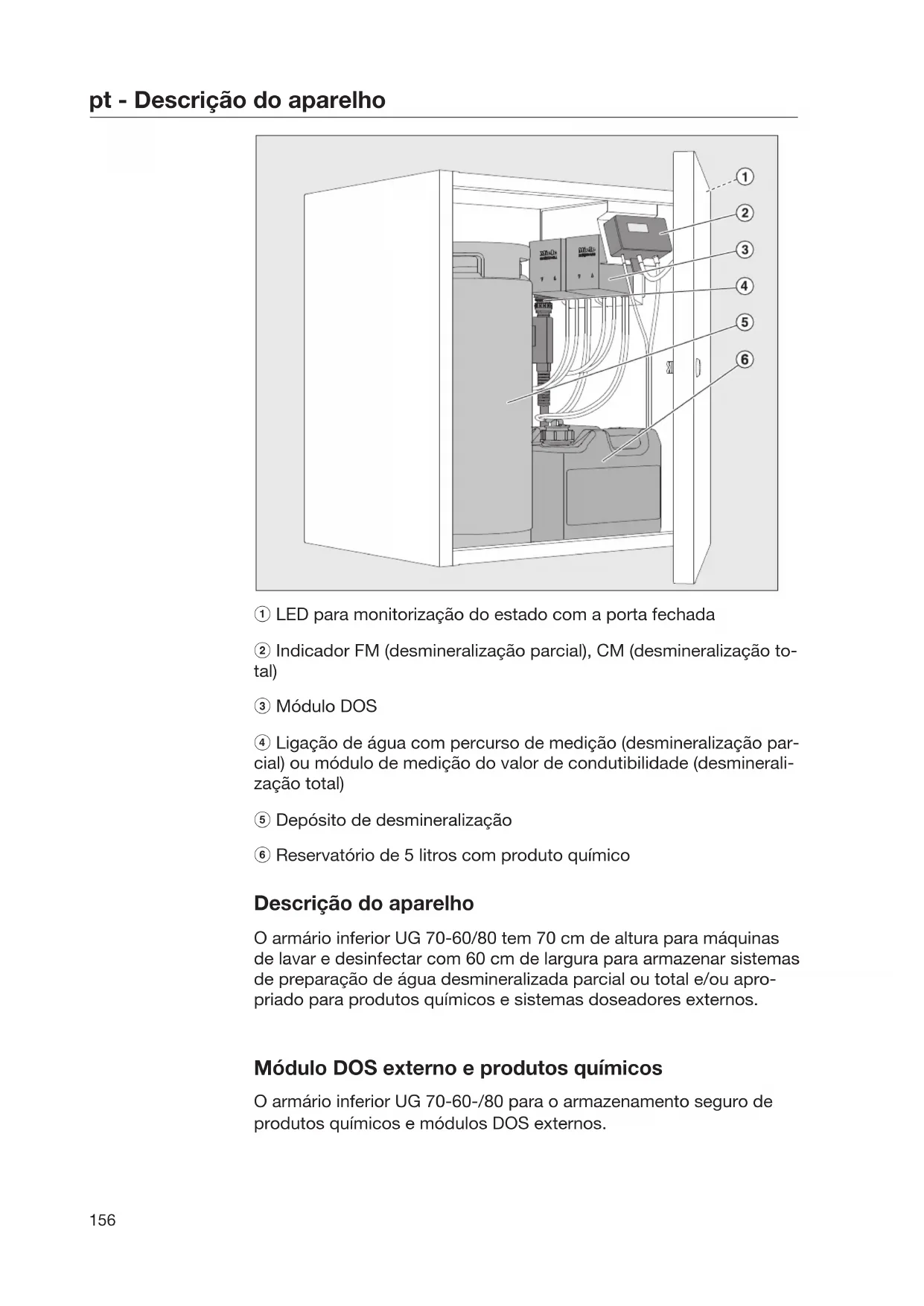 LED para monitorização do estado com a porta fechada Indicador FM (desmineralização parcial), CM (desmineralização to- tal) Módulo DOS Ligação de água com percurso de medição (desmineralização par- cial) ou módulo de medição do valor de condutibilidade (desminerali- zação total) Depósito de desmineralização Reservatório de 5 litros com produto químico Descrição do aparelho O armário inferior UG 70-60/80 tem 70 cm de altura para máquinas de lavar e desinfectar com 60 cm de largura para armazenar sistemas de preparação de água desmineralizada parcial ou total e/ou apro- priado para produtos químicos e sistemas doseadores externos. Módulo DOS externo e produtos químicos O armário inferior UG 70-60-/80 para o armazenamento seguro de produtos químicos e módulos DOS externos.pt - Descrição do aparelho
