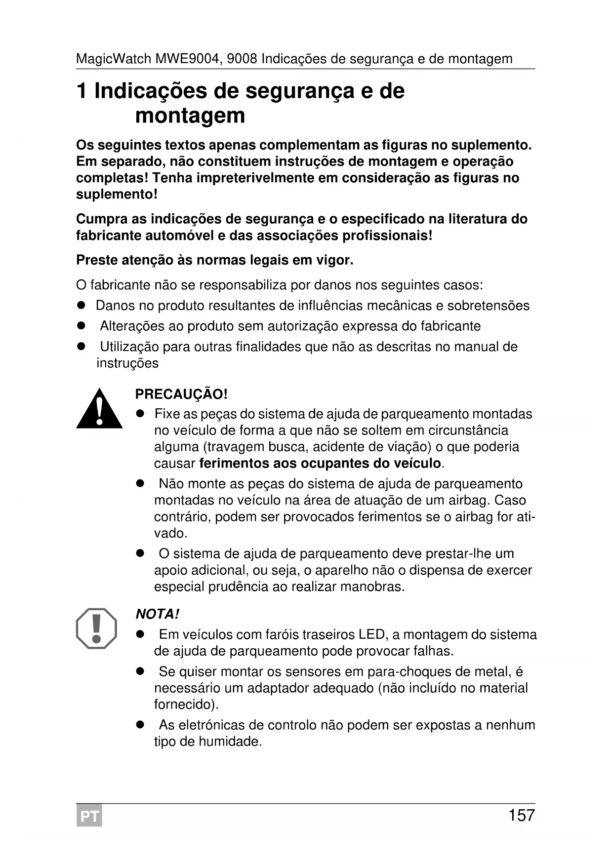 NOTA! Pare o veículo imediatamente e verifique a situação (se necessá- rio, saia do veículo) se, ao realizar manobras, acontecer o seguinte: ao realizar manobras o aparelho indica primeiro um obstáculo e a sequência de sinais sonoros torna-se mais rápida, como é normal (por exemplo, passagem de uma sequência de sinais sonoros lenta para uma média). De repente, a sequência de sinais sonoros fica lenta ou deixa de ser indicado um obstáculo. Isto significa que o obstáculo original saiu da área de deteção dos sensores (conforme a estrutura) mas que ainda pode ser atin- gido. NOTA! O sistema não funciona se um ou mais sensores possuírem uma avaria.PT MagicWatch MWE9004, 9008 Garantia