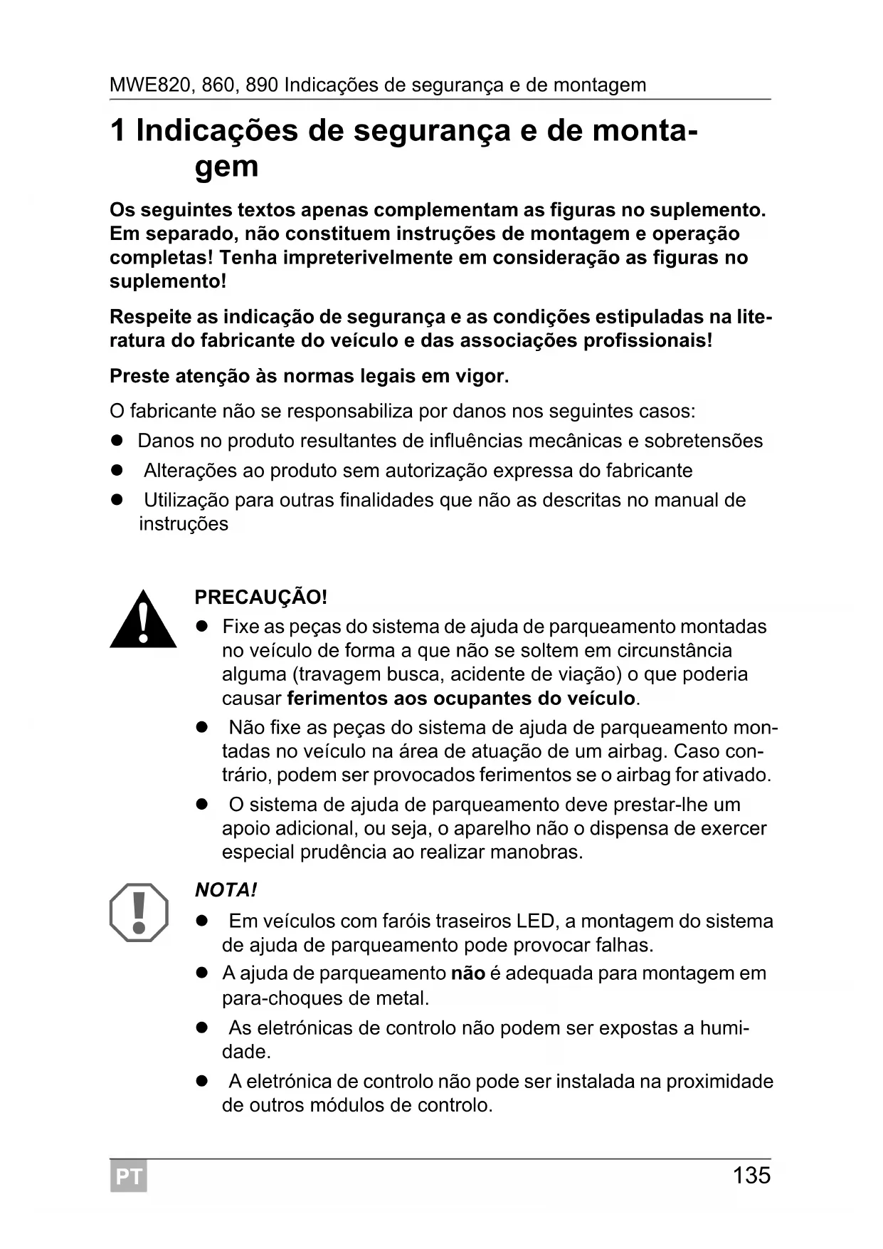 PRECAUÇÃO! Fixe as peças do sistema de ajuda de parqueamento montadas no veículo de forma a que não se soltem em circunstância alguma (travagem busca, acidente de viação) o que poderia causar ferimentos aos ocupantes do veículo. Não fixe as peças do sistema de ajuda de parqueamento mon- tadas no veículo na área de atuação de um airbag. Caso con- trário, podem ser provocados ferimentos se o airbag for ativado. O sistema de ajuda de parqueamento deve prestar-lhe um apoio adicional, ou seja, o aparelho não o dispensa de exercer especial prudência ao realizar manobras.