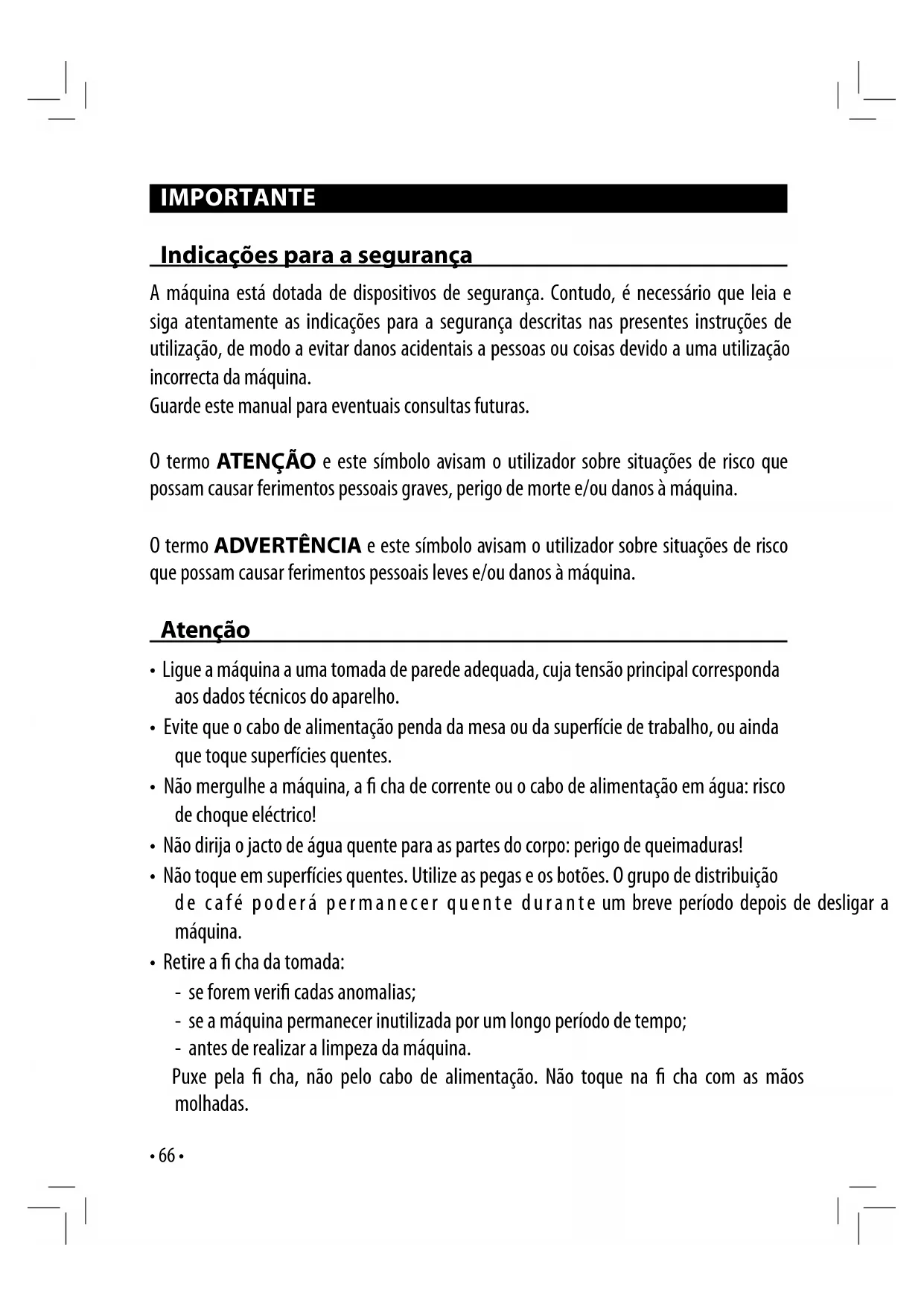 IMPORTANTE Indicações para a segurança A máquina está dotada de dispositivos de segurança. Contudo, é necessário que leia e siga atentamente as indicações para a segurança descritas nas presentes instruções de utilização, de modo a evitar danos acidentais a pessoas ou coisas devido a uma utilização incorrecta da máquina. Guarde este manual para eventuais consultas futuras. O termo ATENÇÃO e este símbolo avisam o utilizador sobre situações de risco que possam causar ferimentos pessoais graves, perigo de morte e/ou danos à máquina. O termo ADVERTÊNCIA e este símbolo avisam o utilizador sobre situações de risco que possam causar ferimentos pessoais leves e/ou danos à máquina. Atenção