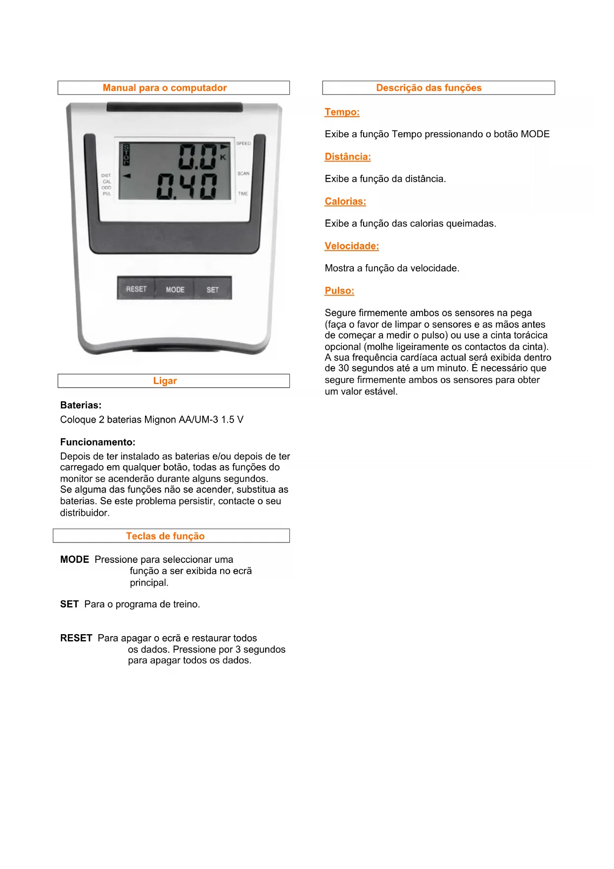 Segure firmamente?), o os sensores na pega (faça o favor de limpar o sensores e as mês antes de fazer a medir o pulso) ou use a cinta torácica optional (molhe ligeiramente os contactos da cinta). A sua frequência cardíaca actual está exibida dentro de 30 segundos até a um minuto. É necessário que segure firmamente?, o os sensores para obter um valor estavel.