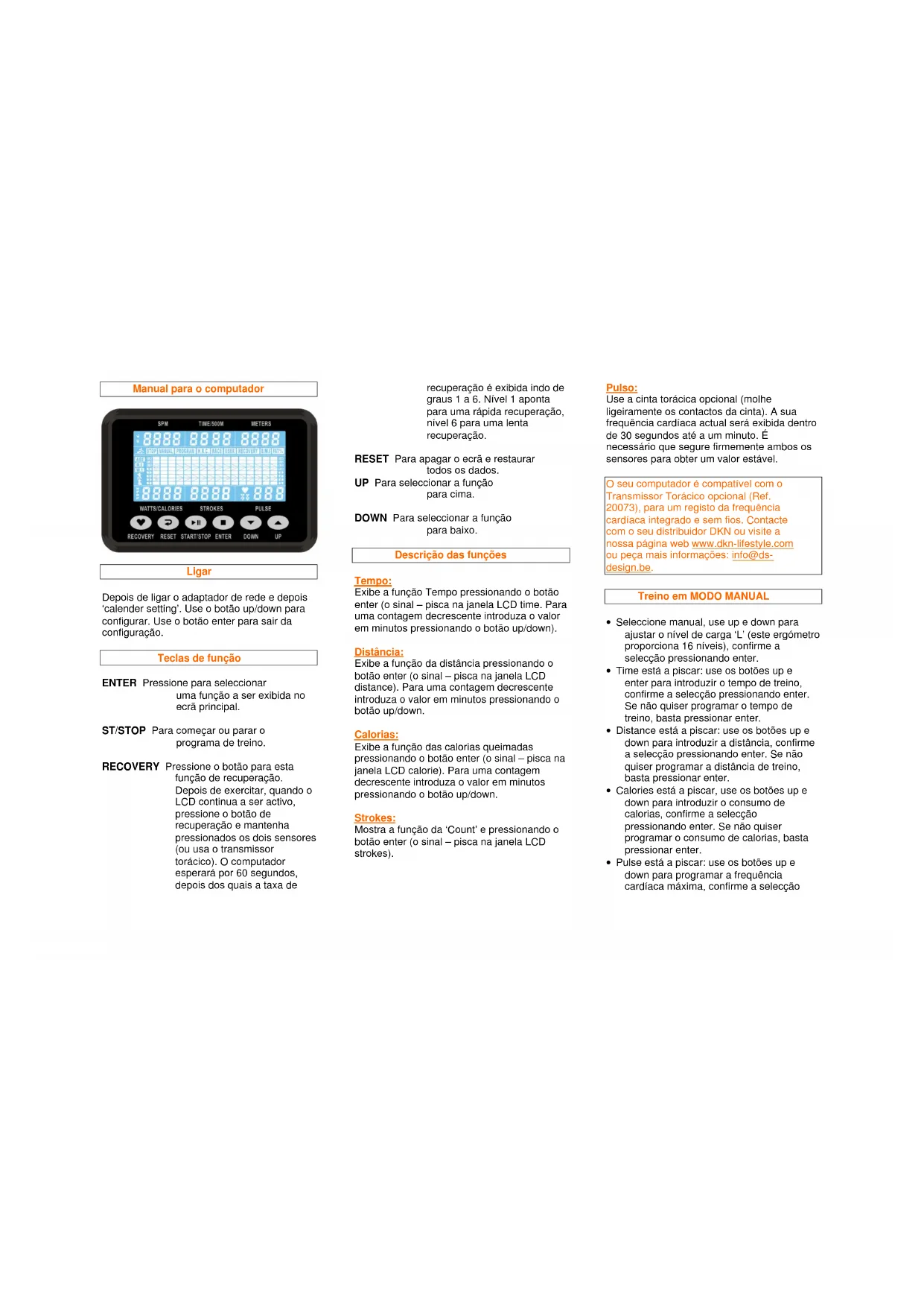 O seu computador é compativel com o Transmissor Toracico optional (Ref. 20073), para um registo da frequência cardiaca integrado e sem fios. Contacte com o seu distribuidor DKN ou visite a)nossa网页 web www.dkn-lifestyle.co ou peça mais informações: info@ds-design.be.