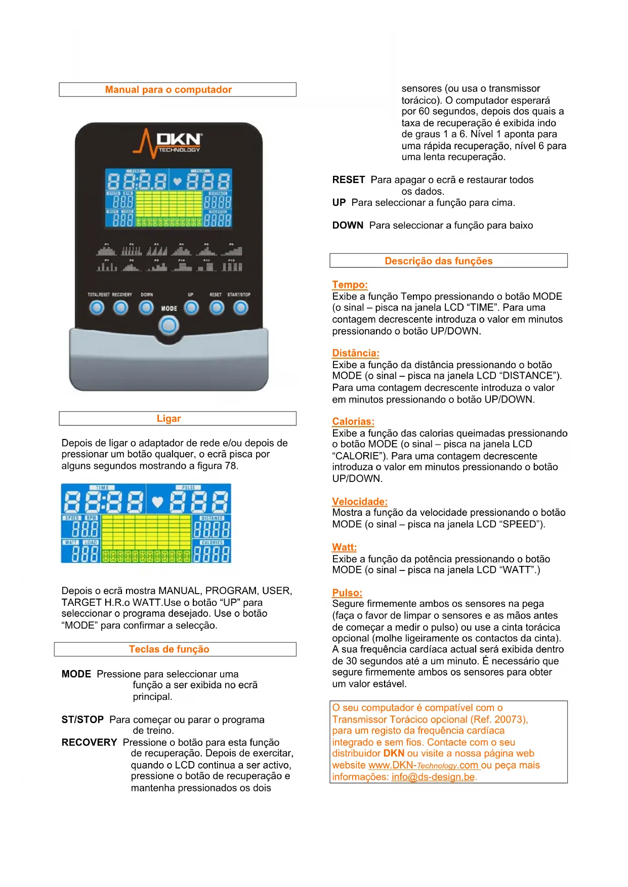 O seu computador é compatível com o Transmissor Torácico opcional (Ref. 20073), para um registo da frequência cardíaca integrado e sem fios. Contacte com o seu distribuidor DKN ou visite a nossa página web website www.DKN-Technology.com ou peça mais informações: info@ds-design.be.