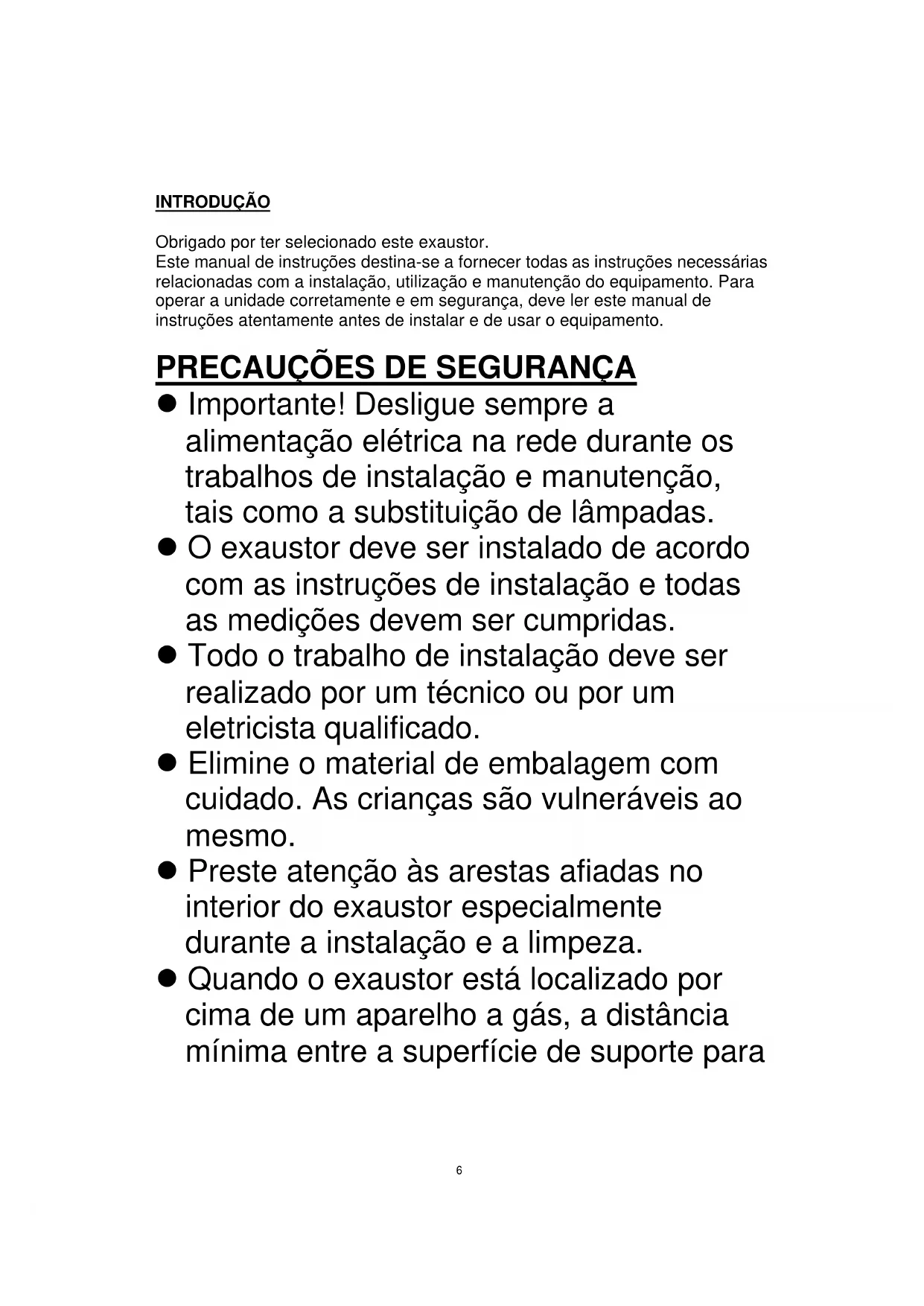 62INTRODUÇÃO Obrigado por ter selecionado este exaustor. Este manual de instruções destina-se a fornecer todas as instruções necessárias relacionadas com a instalação, utilização e manutenção do equipamento. Para operar a unidade corretamente e em segurança, deve ler este manual de instruções atentamente antes de instalar e de usar o equipamento. Importante! Desligue sempre a alimentação elétrica na rede durante os trabalhos de instalação e manutenção, tais como a substituição de lâmpadas.