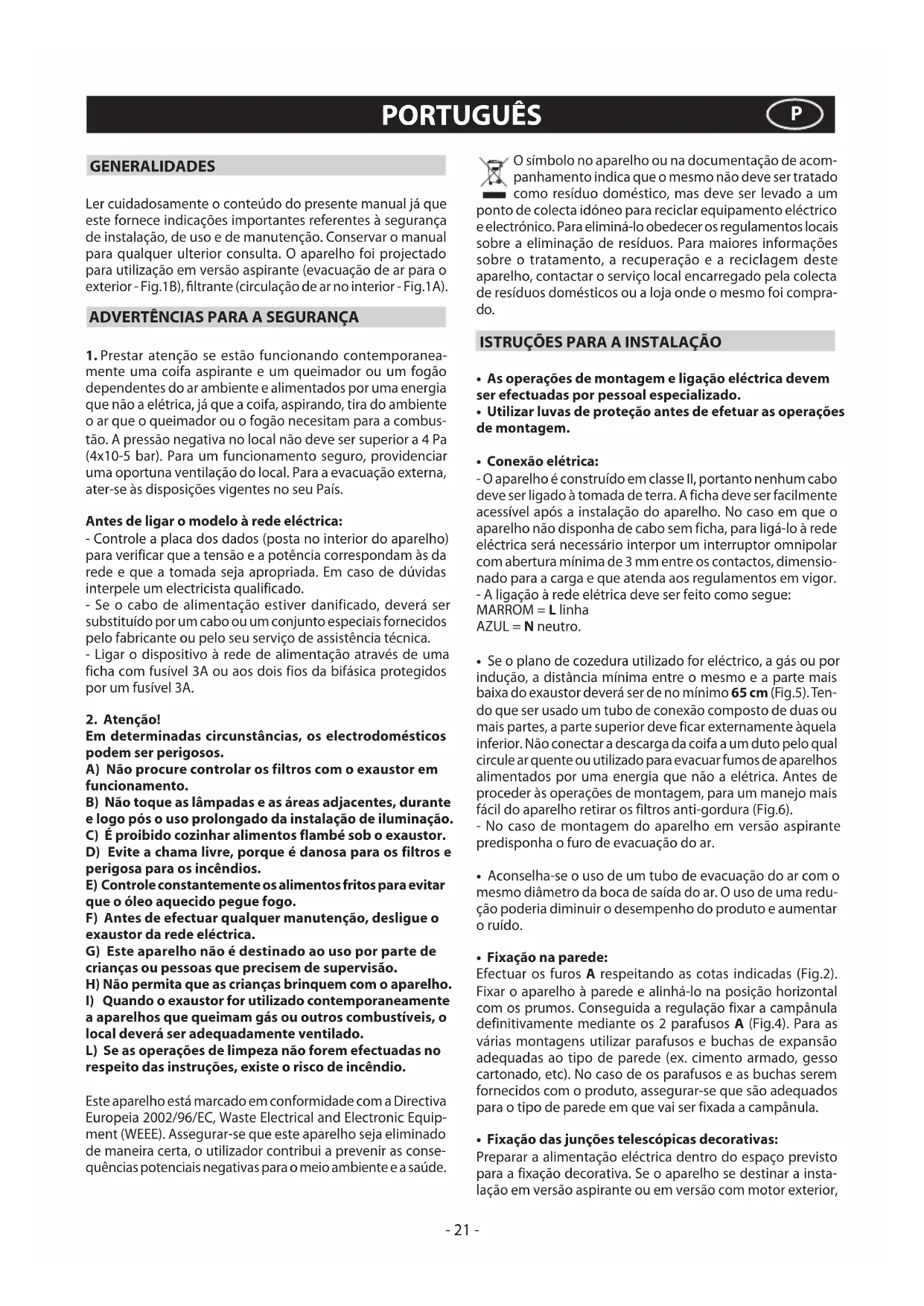 mente uma coifa aspirante e um queimador ou um fogão dependentes do ar ambiente e alimentados por uma energia que não a elétrica, já que a coifa, aspirando, tira do ambiente o ar que o queimador ou o fogão necesitam para a combus- tão. A pressão negativa no local não deve ser superior a 4 Pa (4x10-5 bar). Para um funcionamento seguro, providenciar uma oportuna ventilação do local. Para a evacuação externa, ater-se às disposições vigentes no seu País. Antes de ligar o modelo à rede eléctrica: - Controle a placa dos dados (posta no interior do aparelho) para verificar que a tensão e a potência correspondam às da rede e que a tomada seja apropriada. Em caso de dúvidas interpele um electricista qualificado. - Se o cabo de alimentação estiver danificado, deverá ser substituído por um cabo ou um conjunto especiais fornecidos pelo fabricante ou pelo seu serviço de assistência técnica. - Ligar o dispositivo à rede de alimentação através de uma ficha com fusível 3A ou aos dois fios da bifásica protegidos por um fusível 3A. 2.Atenção! Em determinadas circunstâncias, os electrodomésticos podem ser perigosos. A)Nãoprocurecontrolarosfiltroscomoexaustorem funcionamento. B)Nãotoqueaslâmpadaseasáreasadjacentes,durante elogopósousoprolongadodainstalaçãodeiluminação. C)Éproibidocozinharalimentosflambésoboexaustor. D) Evite a chama livre, porque é danosa para os filtros e perigosa para os incêndios. E) Controle constantemente os alimentos fritos para evitar que o óleo aquecido pegue fogo. F)Antesdeefectuarqualquermanutenção,desligueo exaustordaredeeléctrica. G)Esteaparelhonãoédestinadoaousoporpartede criançasoupessoasqueprecisemdesupervisão. H)Nãopermitaqueascriançasbrinquemcomoaparelho. I)Quandooexaustorforutilizadocontemporaneamente a aparelhos que queimam gás ou outros combustíveis, o local deverá ser adequadamente ventilado. L)Seasoperaçõesdelimpezanãoforemefectuadasno respeitodasinstruções,existeoriscodeincêndio. Este aparelho está marcado em conformidade com a Directiva Europeia 2002/96/EC, Waste Electrical and Electronic Equip- ment (WEEE). Assegurar-se que este aparelho seja eliminado de maneira certa, o utilizador contribui a prevenir as conse- quências potenciais negativas para o meio ambiente e a saúde. PORTUGUÊS