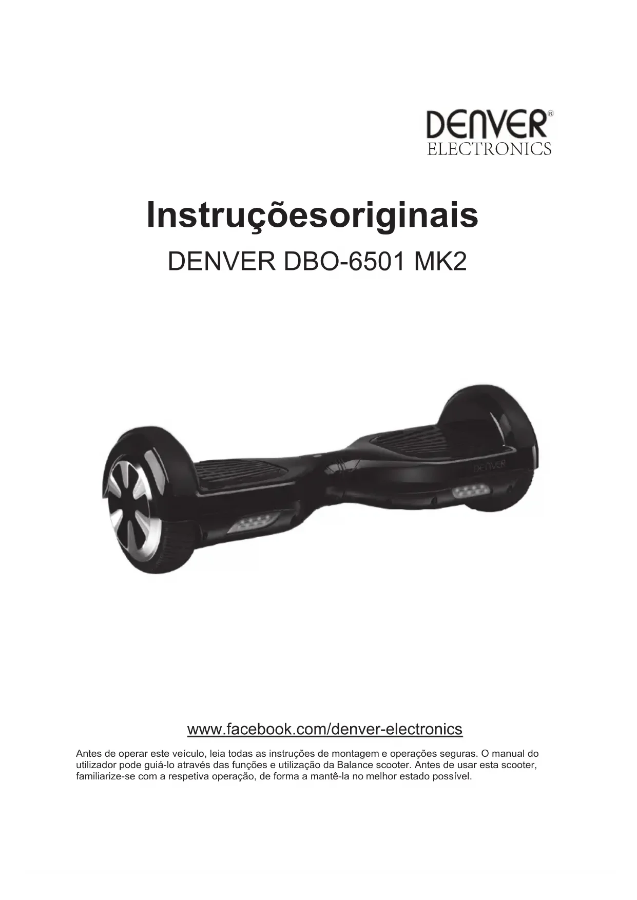 www.facebook.com/denver-electronics Antes de operar este veículo, leia todas as instruções de montagem e operações seguras. O manual do utilizador pode guiá-lo através das funções e utilização da Balance scooter. Antes de usar esta scooter, familiarize-se com a respetiva operação, de forma a mantê-la no melhor estado possível.