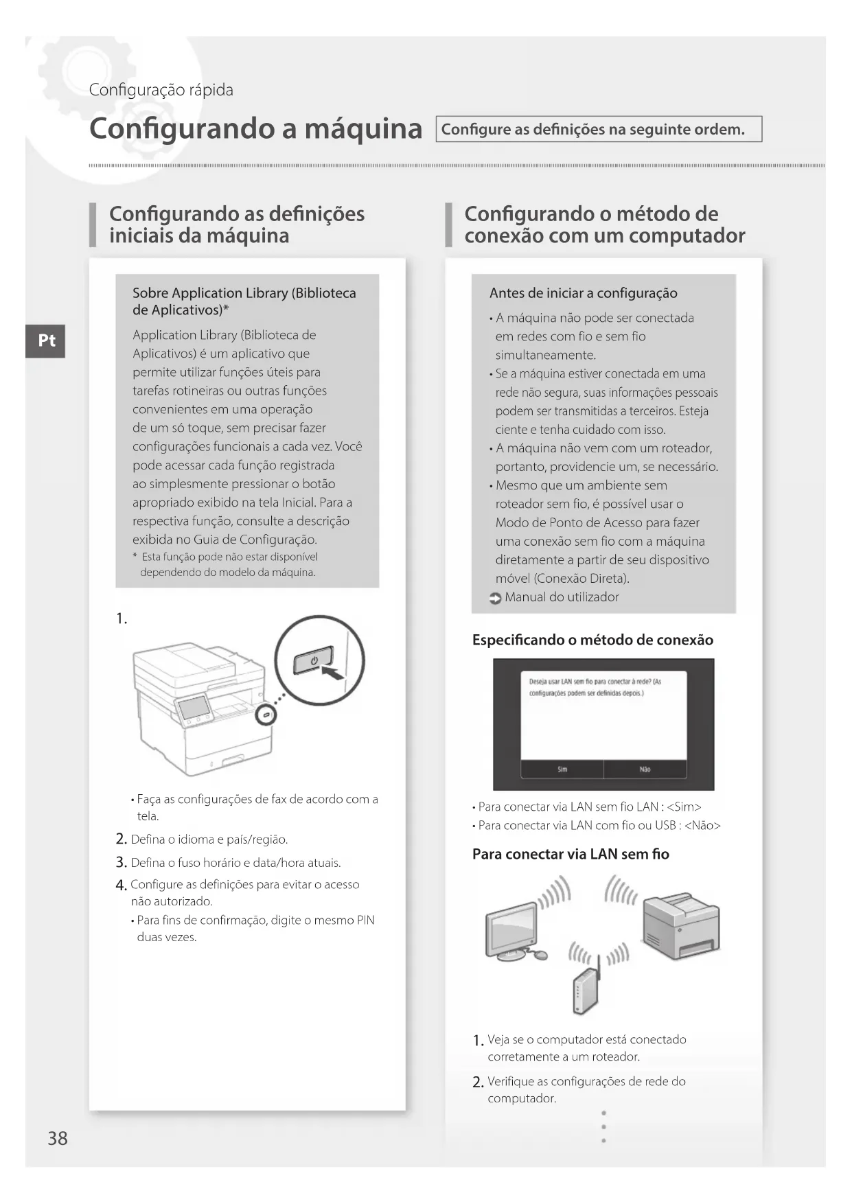 - Faça as configurações de fax de acordo com a tela. Defina o idioma e país/região. Defina o fuso horário e data/hora atuais. Configure as definições para evitar o acesso não autorizado.• Para fins de confirmação, digite o mesmo PIN duas vezes.Antes de iniciar a configuração• A máquina não pode ser conectada em redes com fio e sem fio simultaneamente. Se a máquina estiver conectada em uma rede não segura, suas informações pessoais podem ser transmitidas a terceiros. Esteja ciente e tenha cuidado com isso.• A máquina não vem com um roteador, portanto, providencie um, se necessário.• Mesmo que um ambiente sem roteador sem fio, é possível usar o Modo de Ponto de Acesso para fazer uma conexão sem fio com a máquina diretamente a partir de seu dispositivo móvel (Conexão Direta). Manual do utilizadorEspecicando o método de conexão• Para conectar via LAN sem fio LAN : <Sim>• Para conectar via LAN com fio ou USB : <Não>Para conectar via LAN sem o Veja se o computador está conectado corretamente a um roteador. Verifique as configurações de rede do computador.
