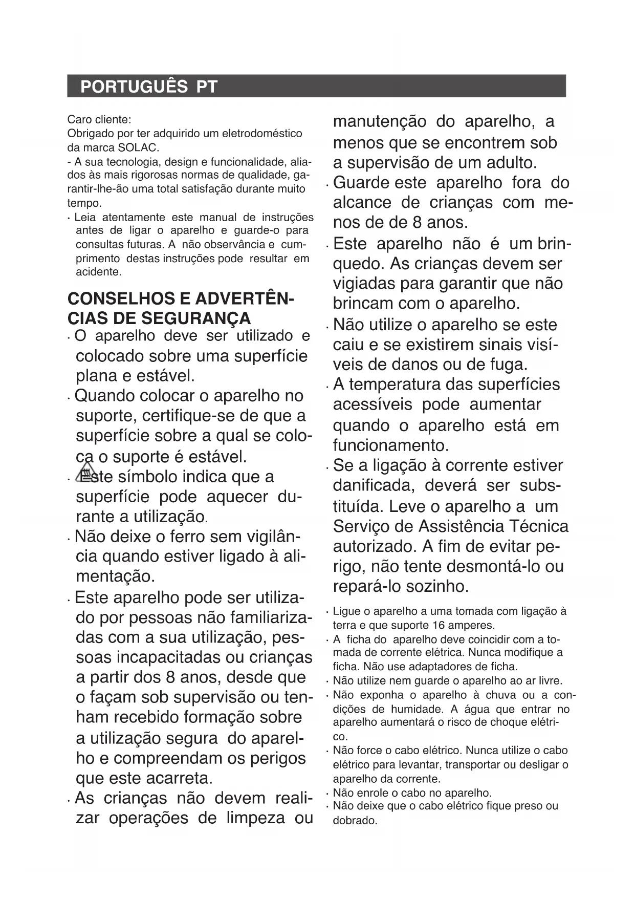 Caro cliente: Obrigado por ter adquirido um eletrodoméstico da marca SOLAC. - A sua tecnologia, design e funcionalidade, alia- dos às mais rigorosas normas de qualidade, ga- rantir-lhe-ão uma total satisfação durante muito tempo.