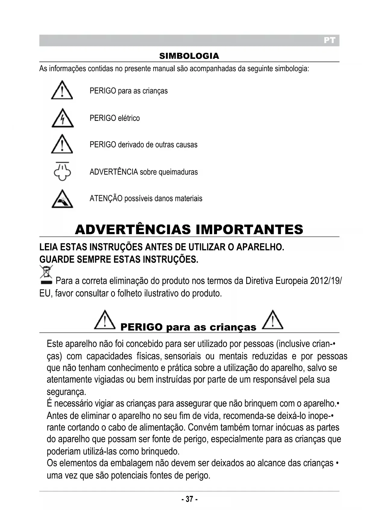 LEIA ESTAS INSTRUÇÕES ANTES DE UTILIZAR O APARELHO. GUARDE SEMPRE ESTAS INSTRUÇÕES. Para a correta eliminação do produto nos termos da Diretiva Europeia 2012/19/ EU, favor consultar o folheto ilustrativo do produto. PERIGO para as crianças Este aparelho não foi concebido para ser utilizado por pessoas (inclusive crian-• ças) com capacidades físicas, sensoriais ou mentais reduzidas e por pessoas que não tenham conhecimento e prática sobre a utilização do aparelho, salvo se atentamente vigiadas ou bem instruídas por parte de um responsável pela sua segurança. É necessário vigiar as crianças para assegurar que não brinquem com o aparelho.• Antes de eliminar o aparelho no seu fim de vida, recomenda-se deixá-lo inope-• rante cortando o cabo de alimentação. Convém também tornar inócuas as partes do aparelho que possam ser fonte de perigo, especialmente para as crianças que poderiam utilizá-las como brinquedo. Os elementos da embalagem não devem ser deixados ao alcance das crianças • uma vez que são potenciais fontes de perigo.- 38 -