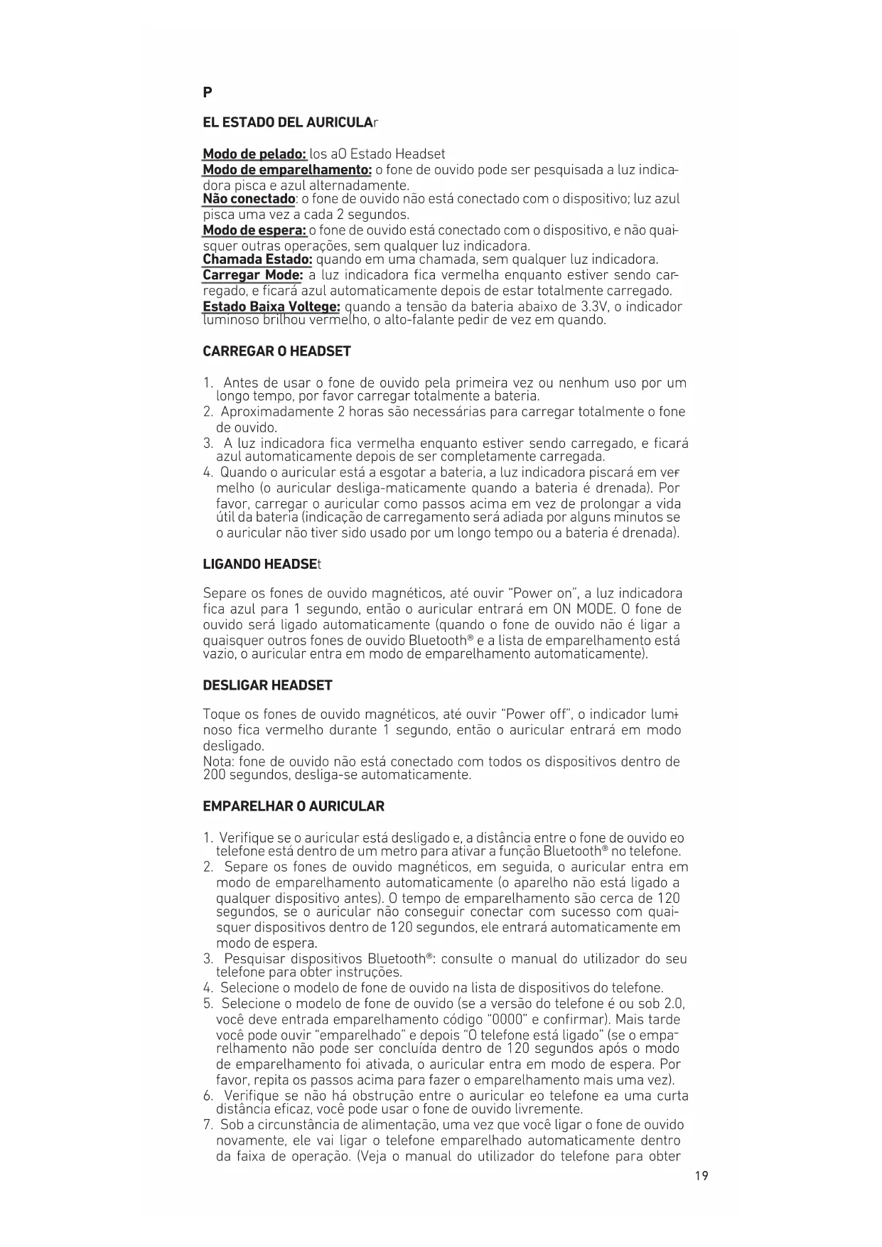 modo de emparelhamento automaticamente (o aparelho não está ligado a qualquer dispositivo antes). O tempo de emparelhamento são cerca de 120 segundos, se o auricular não conseguir conectar com sucesso com quai