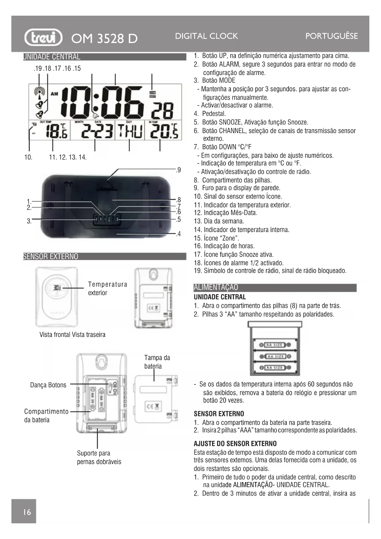 UNIDADE CENTRAL SENSOR EXTERNO Vista frontal Vista traseira Temperatura exterior Tampa da bateria Compartimento da bateria Suporte para pernas dobráveis Dança Botons