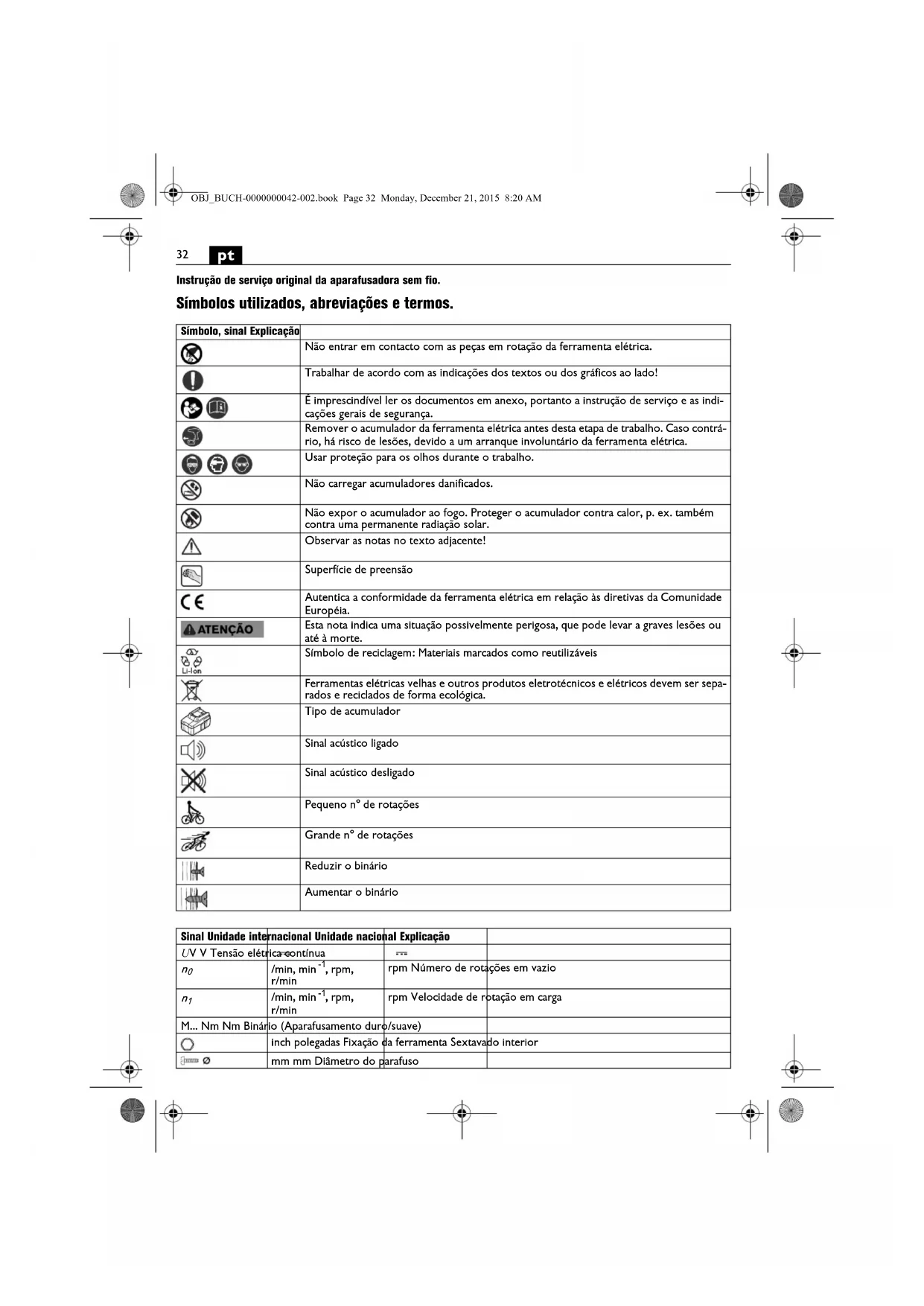 Instrução de serviço original da aparafusadora sem fio. Símbolos utilizados, abreviações e termos. Símbolo, sinal Explicação Não entrar em contacto com as peças em rotação da ferramenta elétrica. Trabalhar de acordo com as indicações dos textos ou dos gráficos ao lado! É imprescindível ler os documentos em anexo, portanto a instrução de serviço e as indi- cações gerais de segurança. Remover o acumulador da ferramenta elétrica antes desta etapa de trabalho. Caso contrá- rio, há risco de lesões, devido a um arranque involuntário da ferramenta elétrica. Usar proteção para os olhos durante o trabalho. Não carregar acumuladores danificados. Não expor o acumulador ao fogo. Proteger o acumulador contra calor, p. ex. também contra uma permanente radiação solar. Observar as notas no texto adjacente! Superfície de preensão Autentica a conformidade da ferramenta elétrica em relação às diretivas da Comunidade Européia. Esta nota indica uma situação possivelmente perigosa, que pode levar a graves lesões ou até à morte. Símbolo de reciclagem: Materiais marcados como reutilizáveis Ferramentas elétricas velhas e outros produtos eletrotécnicos e elétricos devem ser sepa- rados e reciclados de forma ecológica. Tipo de acumulador Sinal acústico ligado Sinal acústico desligado Pequeno n° de rotações Grande n° de rotações Reduzir o binário Aumentar o binário Sinal Unidade internacional Unidade nacional Explicação U V V Tensão elétrica contínua
