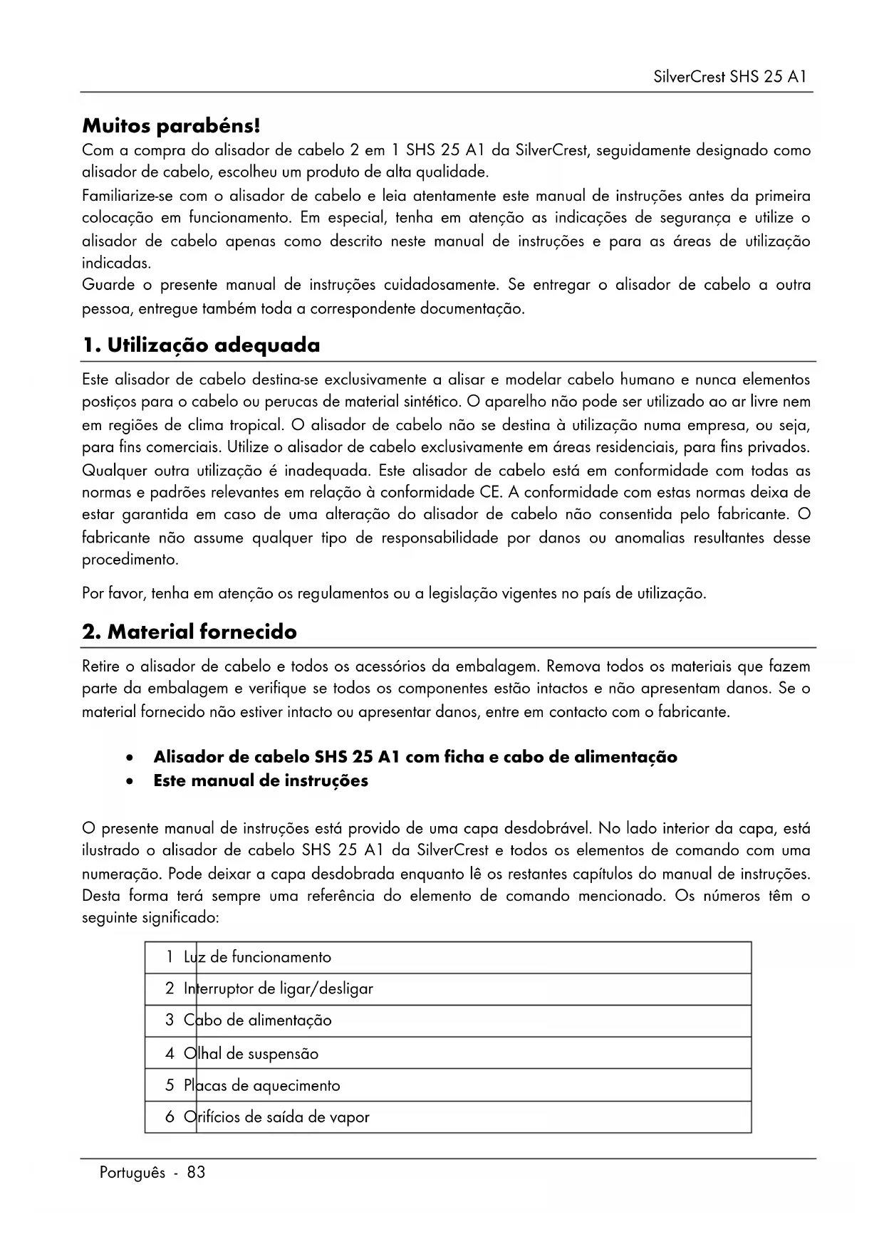 O presente manual de instruções está provido de uma capa desdobrável. No lado inferior da capa, está ilustrado o alisador de cabelo SHS 25 A1 da SilverCrest e todos os elementos de commando com uma numeração. Pode deleiar a capa desdobrada quando é os restantes capítulos do manual de instruções. Donta forma terá sempre uma referencia do elemento de commando mentionado. Os他们在tem o segunte significado: