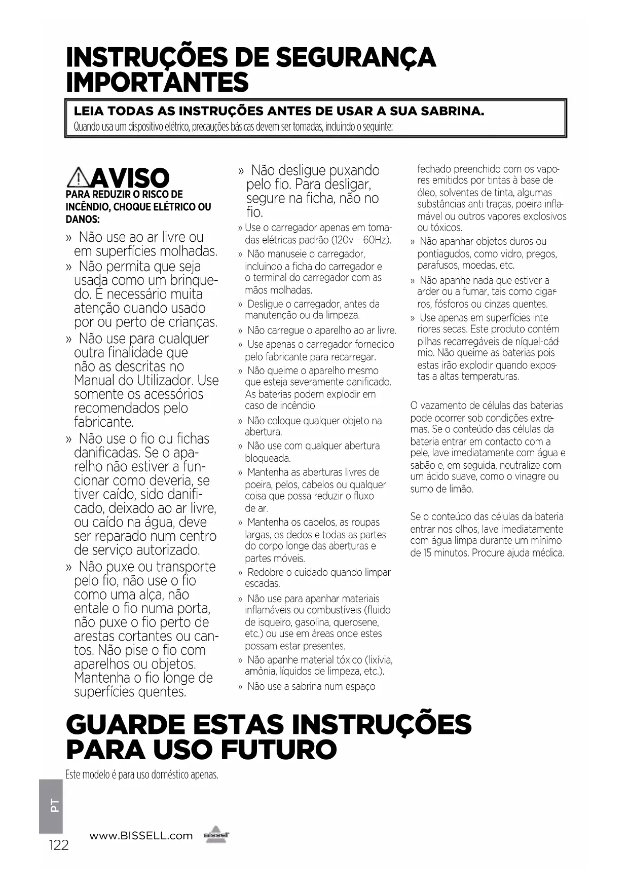 - PT123 www.BISSELL.com Obrigado por comprar uma sabrina BISSELL Estamos felizes pela sua compra de uma sabrina BISSELL. Tudo o que sabemos sobre cuidados com pisos está no projeto e construção deste sistema avançado completo de limpeza da casa. A sua sabrina BISSELL é de boa qualidade, e oferecemos uma garan- tia limitada de um ano. Nós também o apoiamos com um experiente e dedicado Serviço de Atendimento ao Consumidor, por isso, se tiver um problema, vai receber uma assis- tência rápida e atenciosa. O meu bisavô inventou a sabrina em 1876. Hoje, a BISSELL é líder mundial na conceção, fabrico e serviço de produtos de cuidados domiciliares de alta qualidade como a sua sabrina BISSELL. Obrigado mais uma vez, de todos nós da BISSELL. Mark J. Bissell Presidente do Conselho de Administração Instruções de segurança p. 122