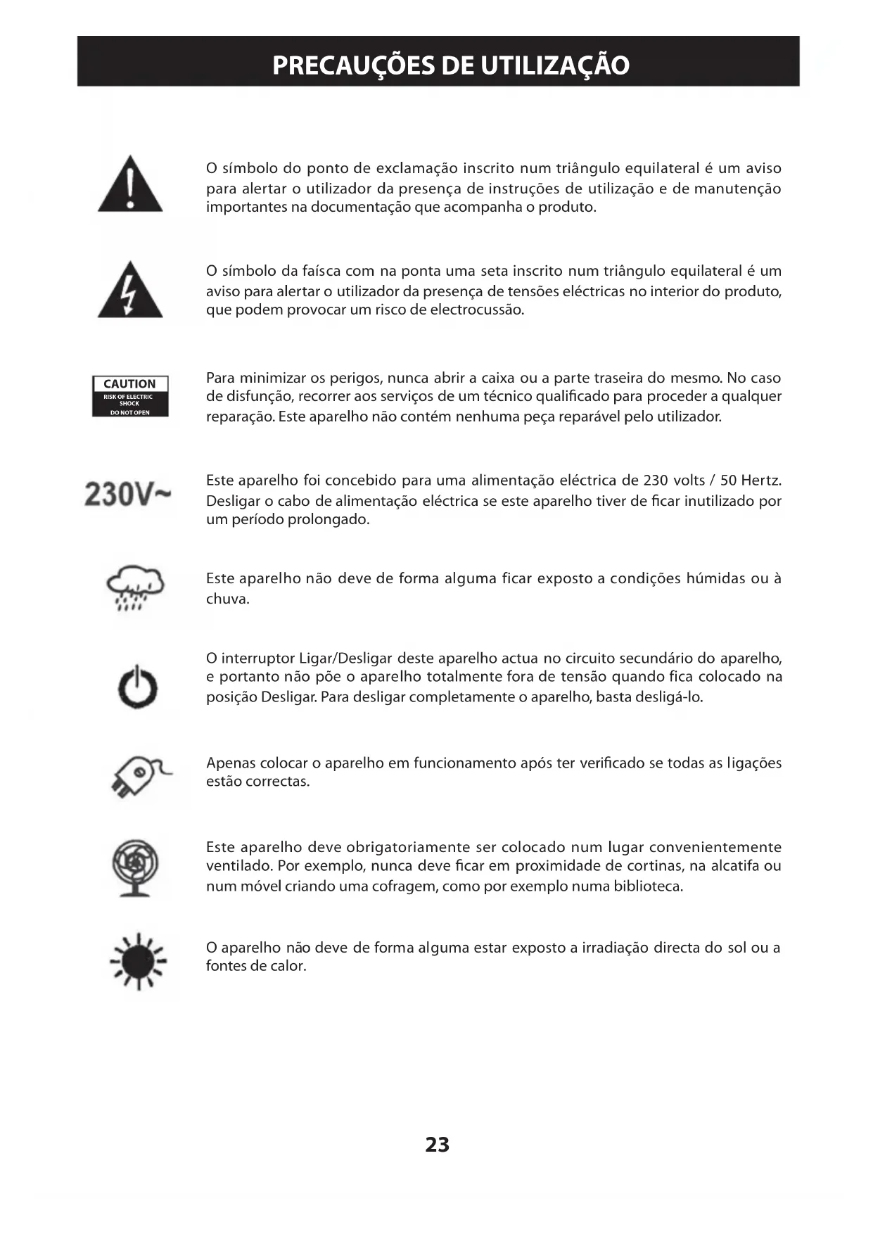 Este aparecido foi concebido para uma alimentação eletrica de 230 volts / 50 Hertz. Desligar o cabo de alimentação eletrica se este aparecido tiver de fazer inutilizar por um periodo prolongado.