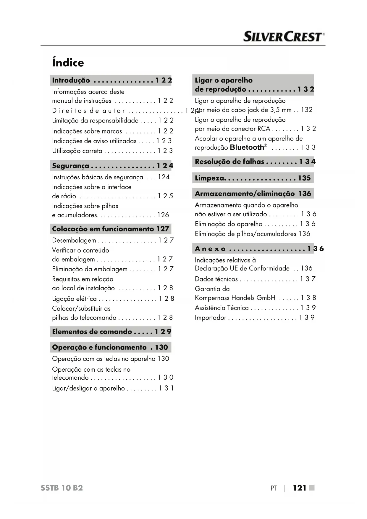 são marcas registadas da Bluetooth SIG, Inc. (Special Interest Group). Qualquer utilização da marca pela Kompernaß Handels GmbH é realizada no âmbito de uma licença. A marca SilverCrest e a denominação comercial são propriedade do respetivo proprietário. Todos os outros nomes e produtos podem ser marcas ou marcas registadas dos respetivos proprietários.PT │ 123 ■ SSTB 10 B2 Indicações de aviso utilizadas No presente manual de instruções são utilizadas as seguintes indicações de aviso: PERIGO Uma indicação de aviso deste nível de perigo identifica uma possível situação de perigo. Se a situação de perigo não for evitada, existe perigo de ferimentos graves ou morte. ► Seguir as instruções desta indicação de aviso para evitar o perigo de ferimentos graves ou morte. ATENÇÃO Uma indicação de aviso deste nível de perigo identifica possíveis danos materiais. Se a situação não for evitada, existe perigo de danos materiais. ► Seguir as instruções desta indicação de aviso para evitar danos materiais. NOTA ► Uma nota fornece informações adicionais que facilitam o manuseamento do aparelho. Utilização correta Este aparelho pertence ao setor da eletrónica de consumo, destinando-se exclusiva- mente à reprodução de ficheiros de áudio via Bluetooth