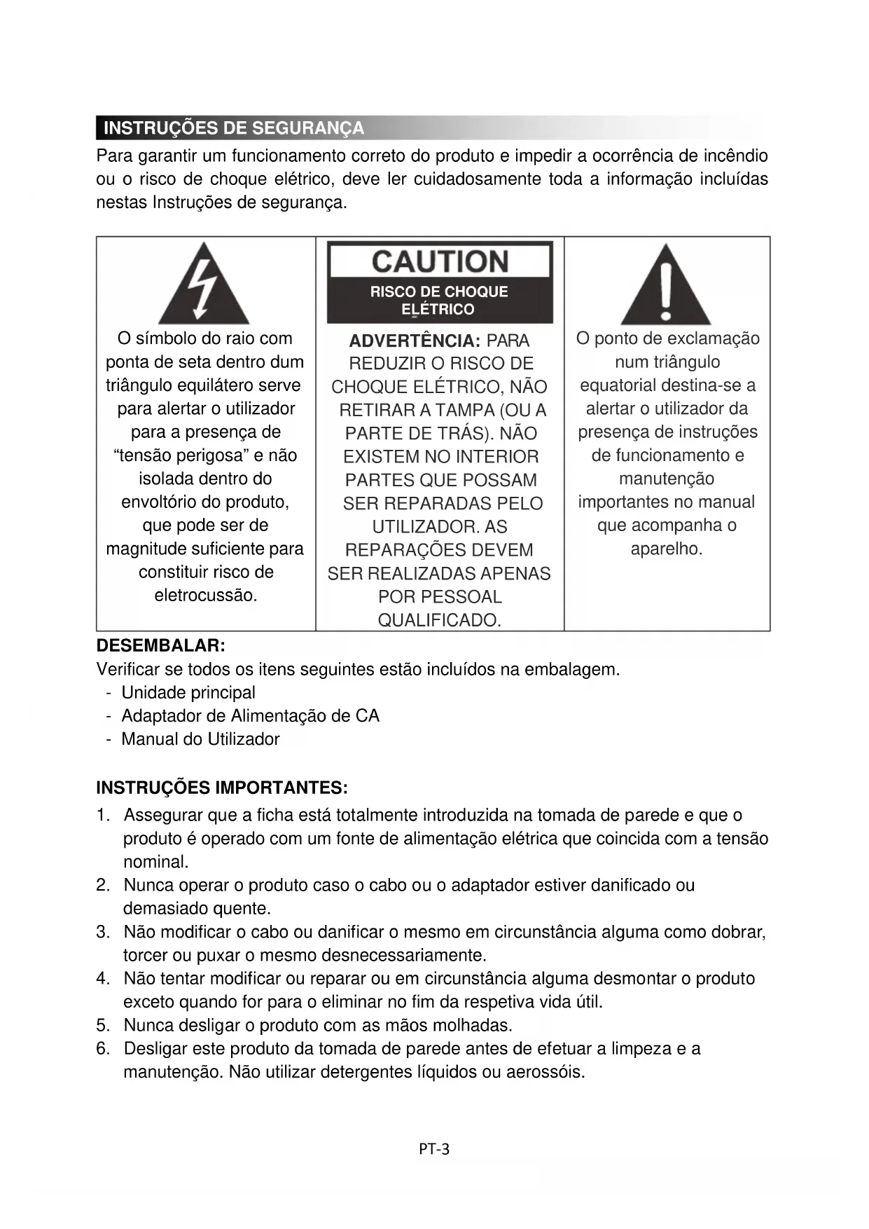 ADVERTÊNCIA: PARA REDUZIR O RISCO DE CHOQUE ELÉTRICO, NÃO RETIRAR A TAMPA (OU A PARTE DE TRÁS). NÃO EXISTEM NO INTERIOR PARTES QUE POSSAM SER REPARADAS PELO UTILIZADOR. AS REPARAÇÕES DEVEM SER REALIZADAS APENAS POR PESSOAL QUALIFICADO.