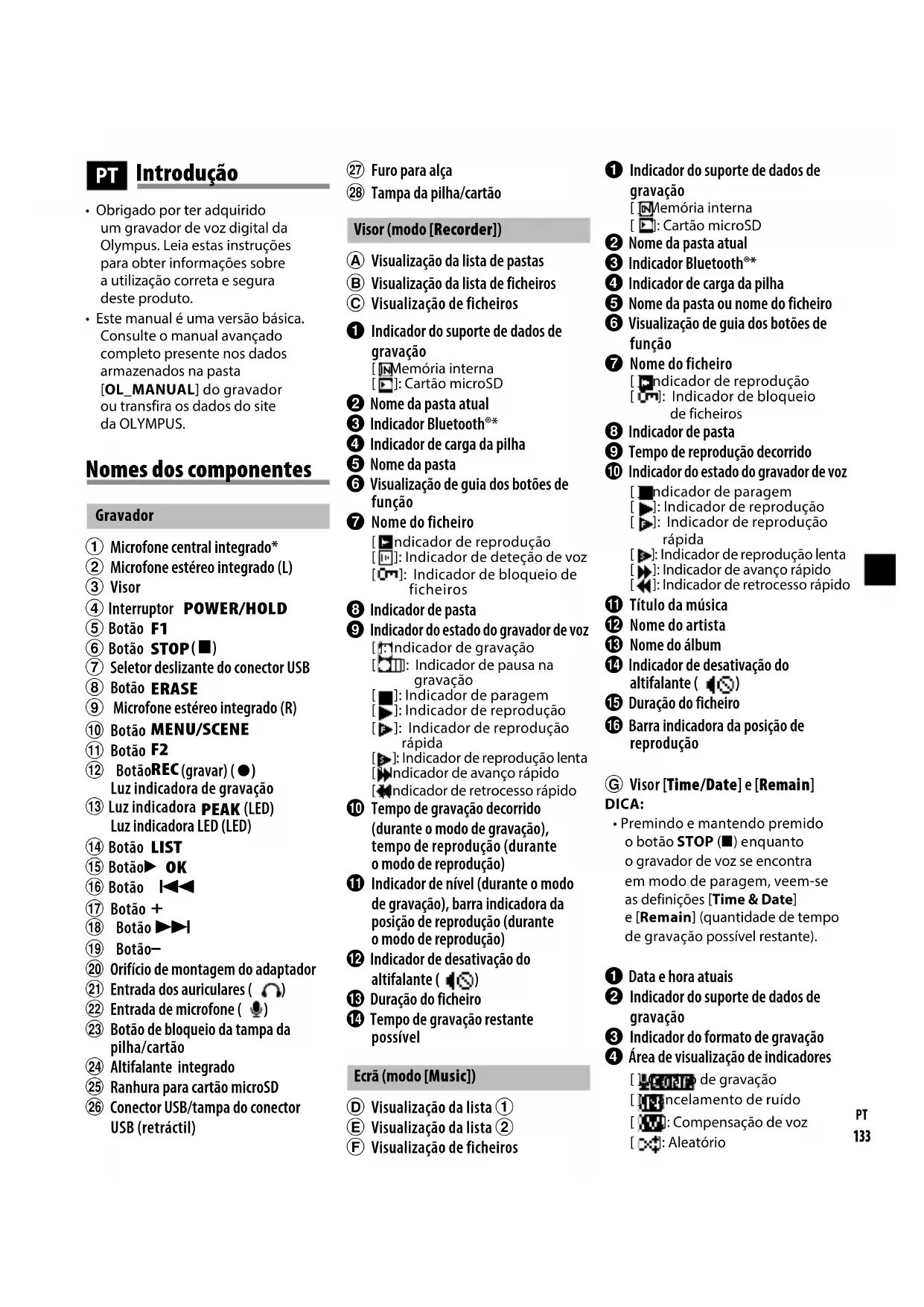 - Este manual é uma versão básica. Consulte o manual avançado completo presente nos dados armazenados na pasta [OL_MANUAL] do gravador ou transfira os dados do site daOLYMPUS. Introdução