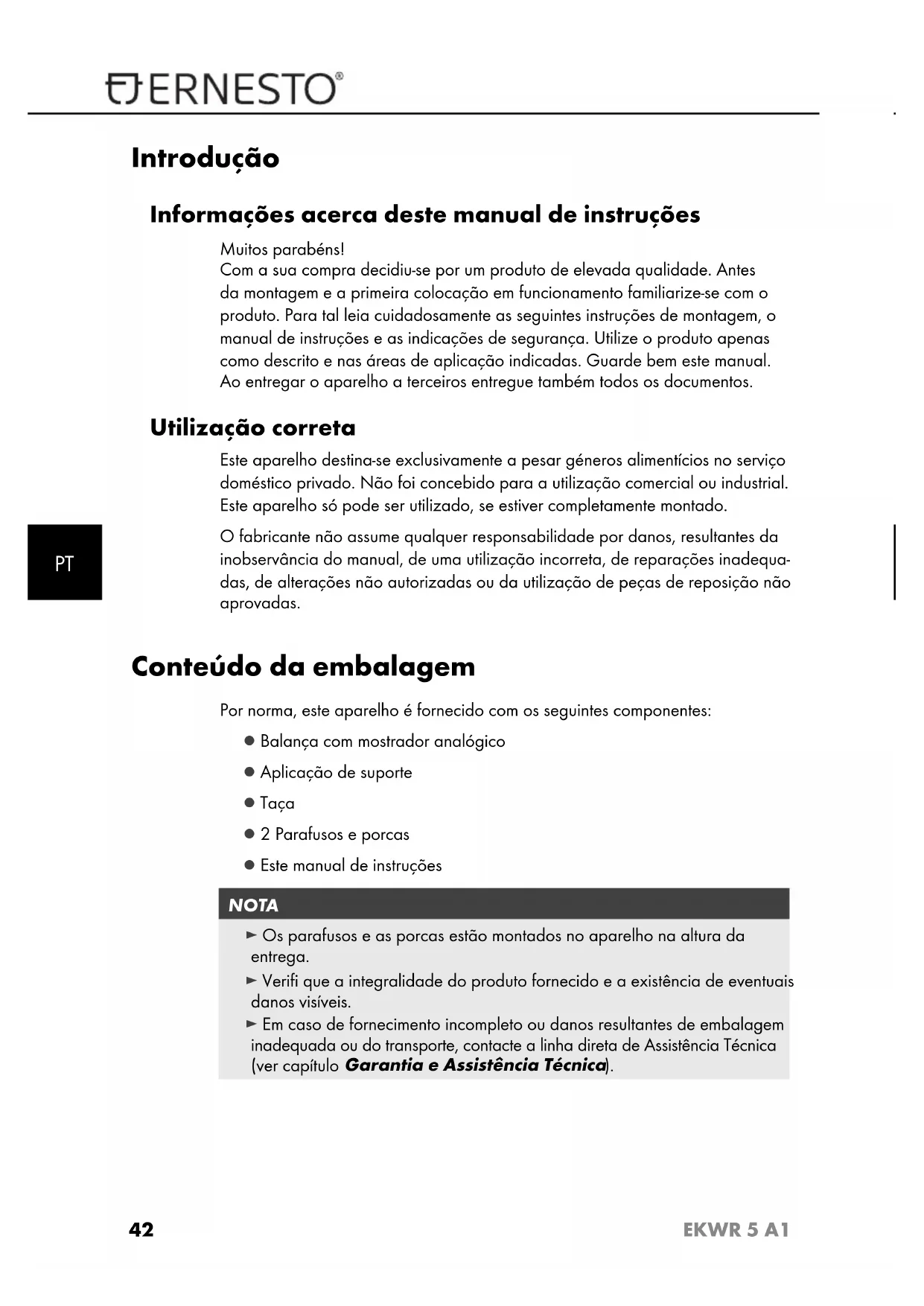 EKWR 5 A1 Introdução Informações acerca deste manual de instruções Muitos parabéns!Com a sua compra decidiu-se por um produto de elevada qualidade. Antes da montagem e a primeira colocação em funcionamento familiarize-se com o produto. Para tal leia cuidadosamente as seguintes instruções de montagem, o manual de instruções e as indicações de segurança. Utilize o produto apenas como descrito e nas áreas de aplicação indicadas. Guarde bem este manual. Ao entregar o aparelho a terceiros entregue também todos os documentos. Utilização correta Este aparelho destina-se exclusivamente a pesar géneros alimentícios no serviço doméstico privado. Não foi concebido para a utilização comercial ou industrial. Este aparelho só pode ser utilizado, se estiver completamente montado. O fabricante não assume qualquer responsabilidade por danos, resultantes da inobservância do manual, de uma utilização incorreta, de reparações inadequa-das, de alterações não autorizadas ou da utilização de peças de reposição não aprovadas. Conteúdo da embalagem Por norma, este aparelho é fornecido com os seguintes componentes: ▯ Balança com mostrador analógico ▯ Aplicação de suporte ▯ Taça ▯ 2 Parafusos e porcas ▯ Este manual de instruções NOTA ► Os parafusos e as porcas estão montados no aparelho na altura da entrega. ► Verifi que a integralidade do produto fornecido e a existência de eventuais danos visíveis. ► Em caso de fornecimento incompleto ou danos resultantes de embalagem inadequada ou do transporte, contacte a linha direta de Assistência Técnica (ver capítulo Garantia e Assistência Técnica ).PT