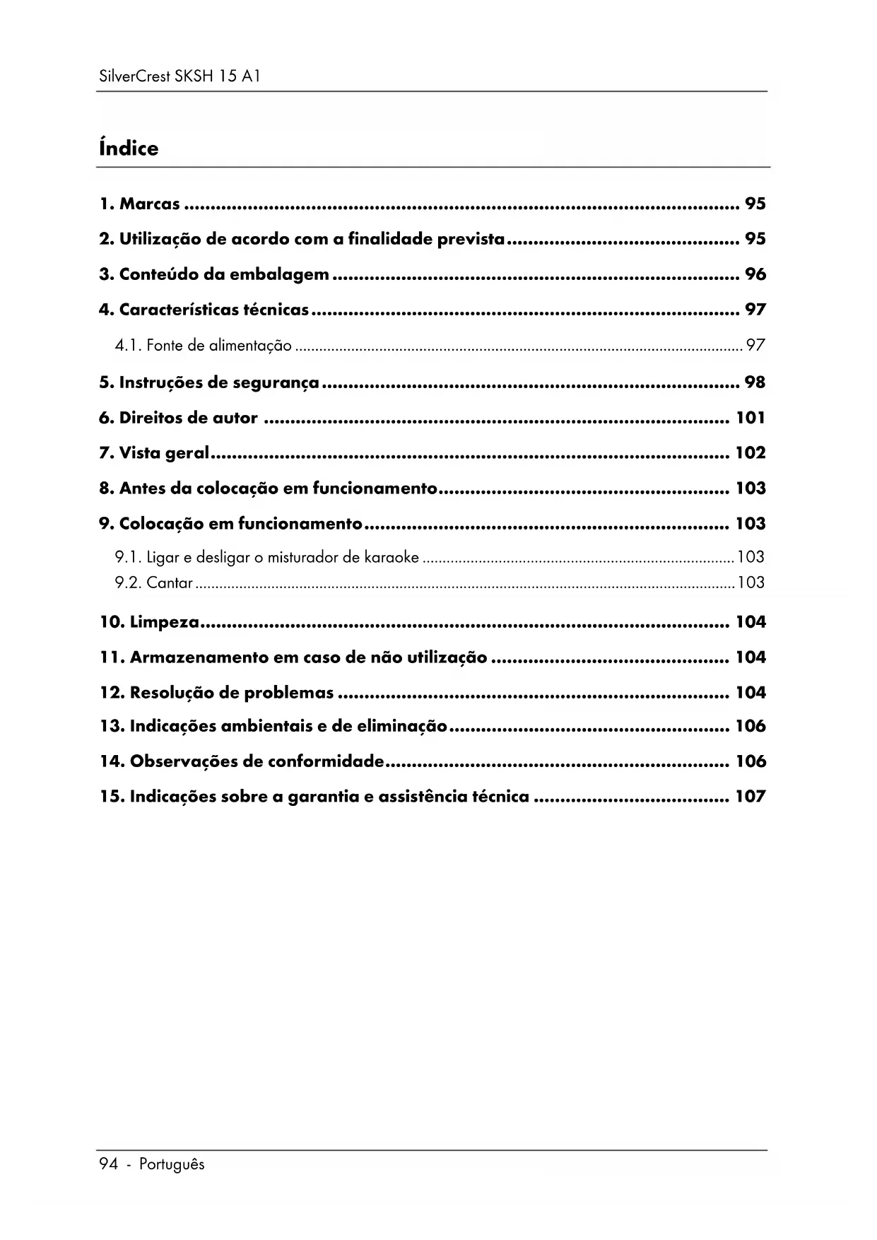 15. Indicações sobre a garantia e assistência técnica ..................................... 107SilverCrest SKSH 15 A1