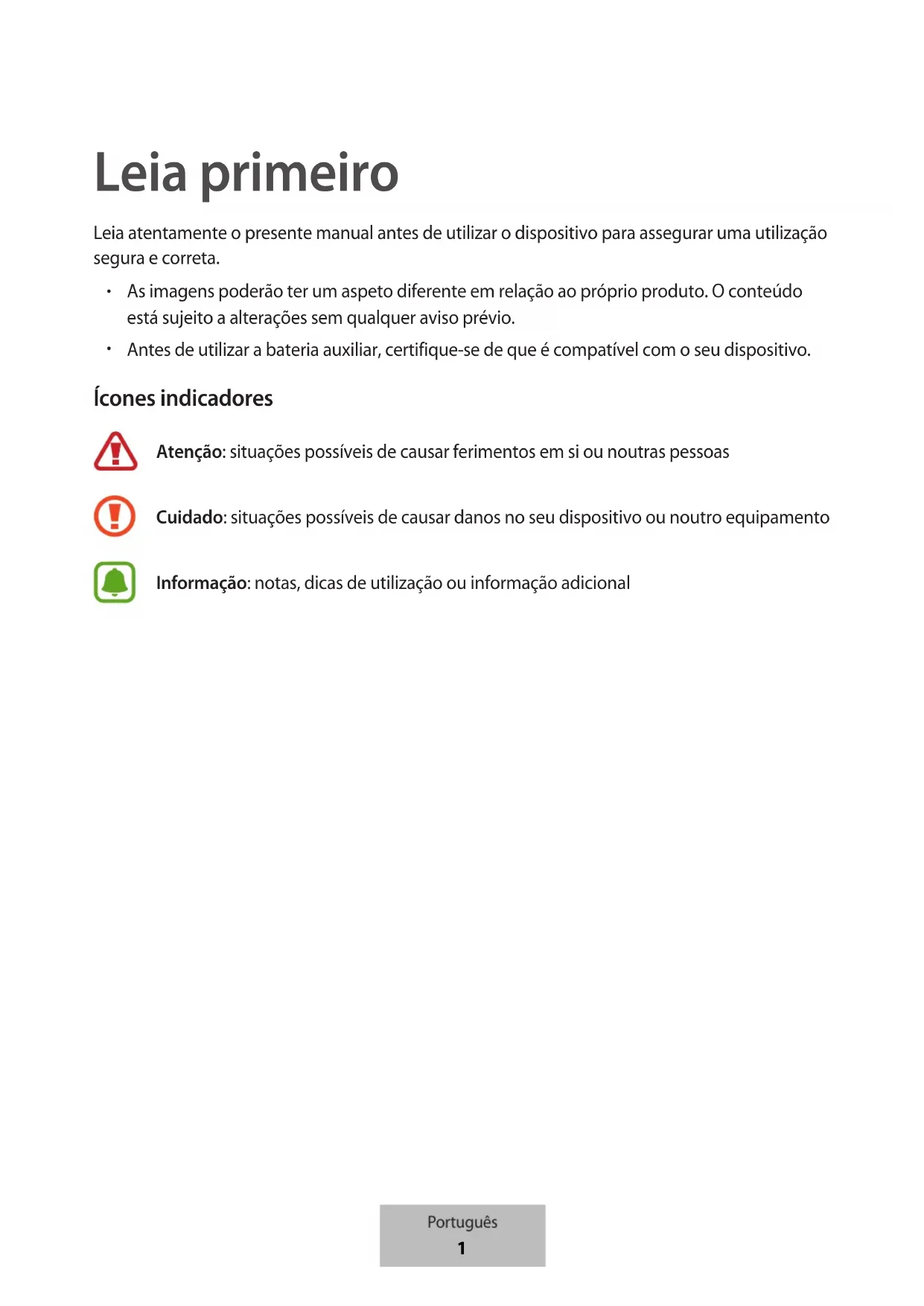 Antes de utilizar a bateria auxiliar, certifique-se de que é compatível com o seu dispositivo. Ícones indicadores Atenção: situações possíveis de causar ferimentos em si ou noutras pessoas Cuidado: situações possíveis de causar danos no seu dispositivo ou noutro equipamento Informação: notas, dicas de utilização ou informação adicional Português