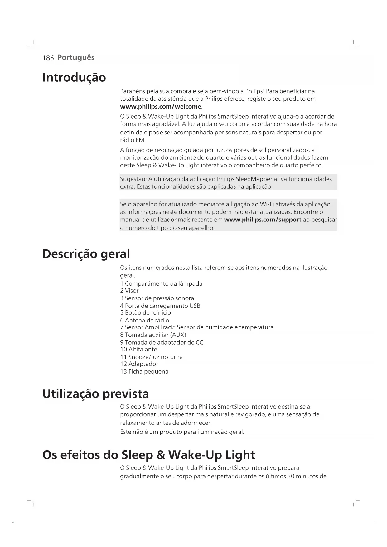 Português Conteúdo Introdução _______________________________________________________________________________ 186 Descrição geral____________________________________________________________________________ 186 Utilização prevista _________________________________________________________________________ 186 Os efeitos do Sleep & Wake-Up Light ________________________________________________________ 186 Informações de segurança importantes ______________________________________________________ 187 Segurança e conformidade _________________________________________________________________ 189 Campos electromagnéticos (CEM) ___________________________________________________________ 189 Ícones de menu interativos _________________________________________________________________ 189 Ligar o seu aparelho ao Wi-Fi _______________________________________________________________ 190 Navegar no menu _________________________________________________________________________ 191 Definir os perfis de despertar _______________________________________________________________ 192 Hora + respaldo de alarma__________________________________________________________________ 193 Snoozer __________________________________________________________________________________ 194 Ignorar o alarme __________________________________________________________________________ 194 Utilizar o aparelho como candeeiro de mesa de cabeceira ______________________________________ 194 Luz noturna ______________________________________________________________________________ 195 Definições ________________________________________________________________________________ 195 Ouvir música______________________________________________________________________________ 196 Programas para descontrair_________________________________________________________________ 197 Simulação do anoitecer ____________________________________________________________________ 198 RelaxBreathe _____________________________________________________________________________ 198 Função da hora de dormir __________________________________________________________________ 200 Carregar o telemóvel ______________________________________________________________________ 200 Limpeza e arrumação ______________________________________________________________________ 200 Reciclagem _______________________________________________________________________________ 200 Garantia e assistência ______________________________________________________________________ 200 Resolução de problemas ___________________________________________________________________ 200 Especificações ____________________________________________________________________________ 204 Software open source e de terceiros _________________________________________________________ 206186 Português Introdução Parabéns pela sua compra e seja bem-vindo à Philips! Para beneficiar na totalidade da assistência que a Philips oferece, registe o seu produto em www.philips.com/welcome. O Sleep & Wake-Up Light da Philips SmartSleep interativo ajuda-o a acordar de forma mais agradável. A luz ajuda o seu corpo a acordar com suavidade na hora definida e pode ser acompanhada por sons naturais para despertar ou por rádio FM. A função de respiração guiada por luz, os pores de sol personalizados, a monitorização do ambiente do quarto e várias outras funcionalidades fazem deste Sleep & Wake-Up Light interativo o companheiro de quarto perfeito. Sugestão: A utilização da aplicação Philips SleepMapper ativa funcionalidades extra. Estas funcionalidades são explicadas na aplicação. Se o aparelho for atualizado mediante a ligação ao Wi-Fi através da aplicação, as informações neste documento podem não estar atualizadas. Encontre o manual de utilizador mais recente em www.philips.com/support ao pesquisar o número do tipo do seu aparelho. Descrição geral Os itens numerados nesta lista referem-se aos itens numerados na ilustração geral. 1 Compartimento da lâmpada 2 Visor 3 Sensor de pressão sonora 4 Porta de carregamento USB 5 Botão de reinício 6 Antena de rádio 7 Sensor AmbiTrack: Sensor de humidade e temperatura 8 Tomada auxiliar (AUX) 9 Tomada de adaptador de CC 10 Altifalante 11 Snooze/luz noturna 12 Adaptador 13 Ficha pequena Utilização prevista O Sleep & Wake-Up Light da Philips SmartSleep interativo destina-se a proporcionar um despertar mais natural e revigorado, e uma sensação de relaxamento antes de adormecer. Este não é um produto para iluminação geral. Os efeitos do Sleep & Wake-Up Light O Sleep & Wake-Up Light da Philips SmartSleep interativo prepara gradualmente o seu corpo para despertar durante os últimos 30 minutos de187 Português sono. Ao início da manhã, os nossos olhos estão mais sensíveis à luz do que quando estamos acordados. Durante esse período, a luz de baixa intensidade de um amanhecer simulado prepara o nosso corpo para despertar e para ficar alerta. As pessoas que utilizam o aparelho acordam com mais facilidade, estão geralmente mais bem dispostas durante a manhã e sentem-se mais enérgicas. Como a sensibilidade à luz varia de pessoa para pessoa, pode definir a intensidade da luz do aparelho para um nível adequado à sua sensibilidade, para começar o dia da melhor forma. Para desfrutar em pleno dos efeitos do Sleep & Wake-Up Light interativo, coloque o aparelho a cerca de 40 – 50cm da cabeça, numa superfície estável e plana da mesa de cabeceira. Para saber mais sobre o Sleep & Wake-Up Light interativo, visite www.philips.com. Informações de segurança importantes Leia cuidadosamente estas informações importantes antes de utilizar o aparelho e guarde-o para uma eventual consulta futura. Perigo