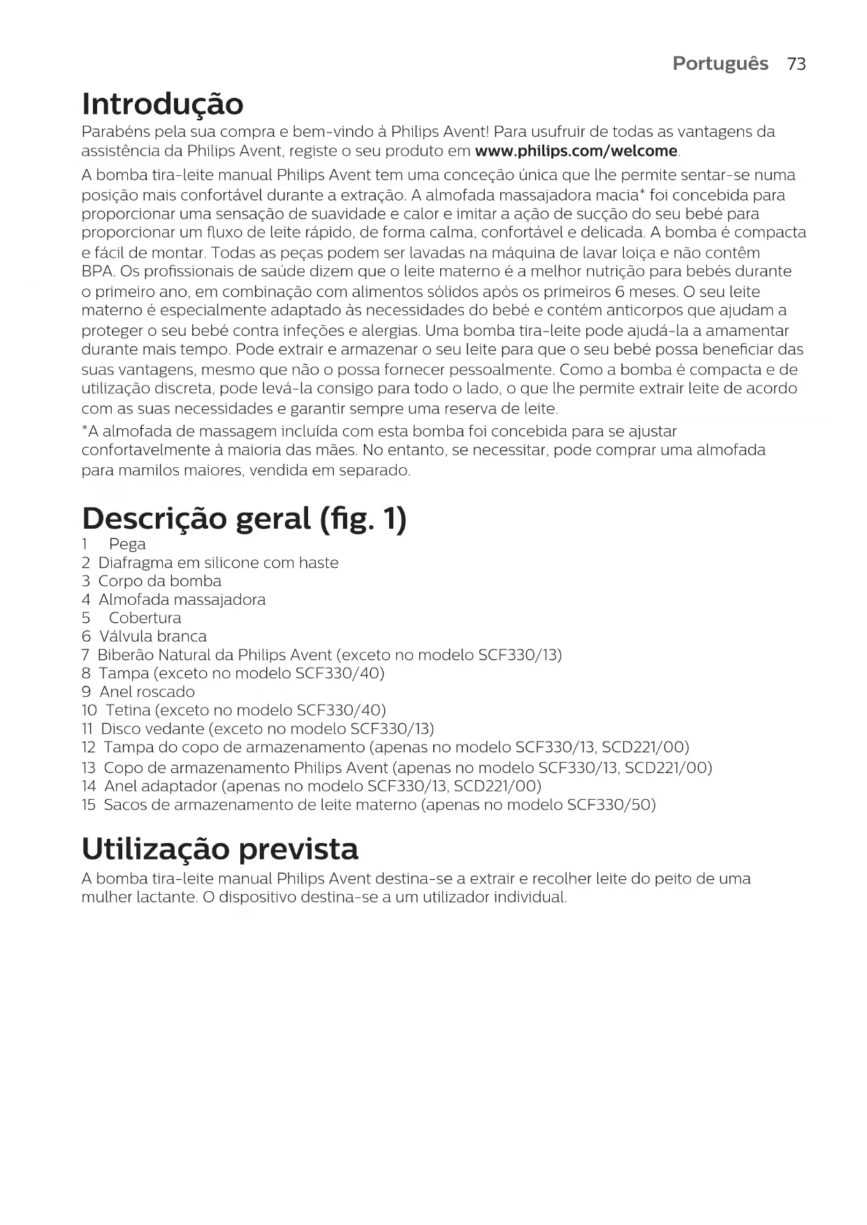 NorskIntrodução Parabéns pela sua compra e bem-vindo à Philips Avent! Para usufruir de todas as vantagens da assistência da Philips Avent, registe o seu produto em www.philips.com/welcome. A bomba tira-leite manual Philips Avent tem uma conceção única que lhe permite sentar-se numa posição mais confortável durante a extração. A almofada massajadora macia* foi concebida para proporcionar uma sensação de suavidade e calor e imitar a ação de sucção do seu bebé para proporcionar um uxo de leite rápido, de forma calma, confortável e delicada. A bomba é compacta e fácil de montar. Todas as peças podem ser lavadas na máquina de lavar loiça e não contêm BPA. Os prossionais de saúde dizem que o leite materno é a melhor nutrição para bebés durante o primeiro ano, em combinação com alimentos sólidos após os primeiros 6 meses. O seu leite materno é especialmente adaptado às necessidades do bebé e contém anticorpos que ajudam a proteger o seu bebé contra infeções e alergias. Uma bomba tira-leite pode ajudá-la a amamentar durante mais tempo. Pode extrair e armazenar o seu leite para que o seu bebé possa beneciar das suas vantagens, mesmo que não o possa fornecer pessoalmente. Como a bomba é compacta e de utilização discreta, pode levá-la consigo para todo o lado, o que lhe permite extrair leite de acordo com as suas necessidades e garantir sempre uma reserva de leite. *A almofada de massagem incluída com esta bomba foi concebida para se ajustar confortavelmente à maioria das mães. No entanto, se necessitar, pode comprar uma almofada para mamilos maiores, vendida em separado. Descrição geral (g. 1) 1 Pega 2 Diafragma em silicone com haste 3 Corpo da bomba 4 Almofada massajadora 5 Cobertura 6 Válvula branca 7 Biberão Natural da Philips Avent (exceto no modelo SCF330/13) 8 Tampa (exceto no modelo SCF330/40) 9 Anel roscado 10 Tetina (exceto no modelo SCF330/40) 11 Disco vedante (exceto no modelo SCF330/13) 12 Tampa do copo de armazenamento (apenas no modelo SCF330/13, SCD221/00) 13 Copo de armazenamento Philips Avent (apenas no modelo SCF330/13, SCD221/00) 14 Anel adaptador (apenas no modelo SCF330/13, SCD221/00) 15 Sacos de armazenamento de leite materno (apenas no modelo SCF330/50) Utilização prevista A bomba tira-leite manual Philips Avent destina-se a extrair e recolher leite do peito de uma mulher lactante. O dispositivo destina-se a um utilizador individual.
