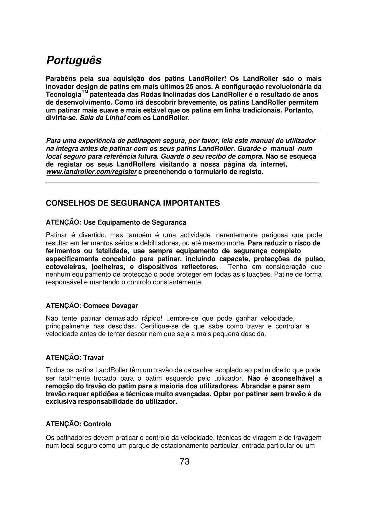 ATENÇÃO: Somente Para Uso Recreativo Os patins LandRoller são designados somente para uso recreativo. Utilize este produto à sua conta e risco. A LandRoller, Inc. não assume qualquer responsabilidade por utilizações negligentes ou descuidadas. As crianças só devem utilizar este produto sob a supervisão de adultos. O utilizador assume todos os riscos de danos pessoais ou de propriedade pessoal.75