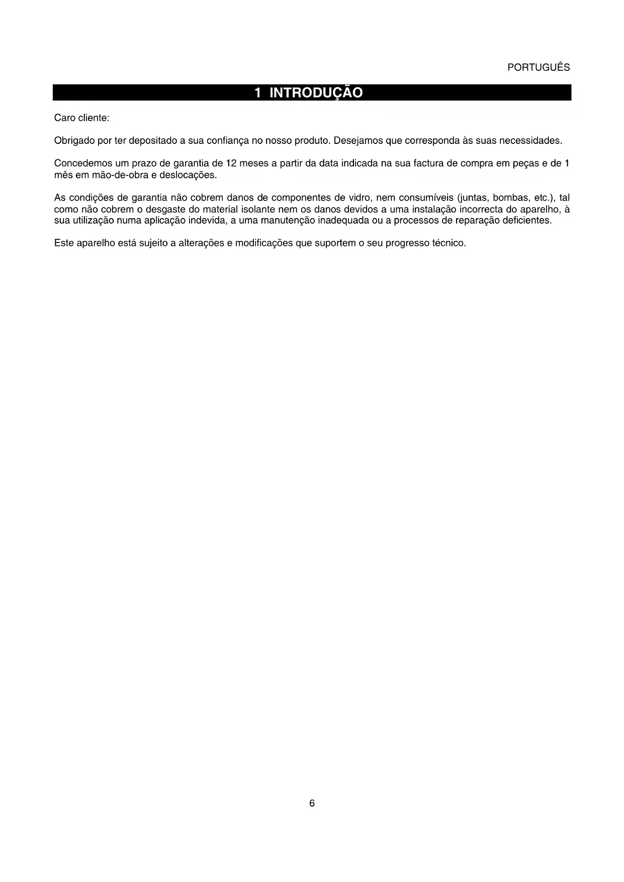 1 INTRODUÇÃO Caro cliente: Obrigado por ter depositado a sua confiança no nosso produto. Desejamos que corresponda às suas necessidades. Concedemos um prazo de garantia de 12 meses a partir da data indicada na sua factura de compra em peças e de 1 mês em mão-de-obra e deslocações. As condições de garantia não cobrem danos de componentes de vidro, nem consumíveis (juntas, bombas, etc.), tal como não cobrem o desgaste do material isolante nem os danos devidos a uma instalação incorrecta do aparelho, à sua utilização numa aplicação indevida, a uma manutenção inadequada ou a processos de reparação deficientes. Este aparelho está sujeito a alterações e modificações que suportem o seu progresso técnico.PORTUGUÊS
