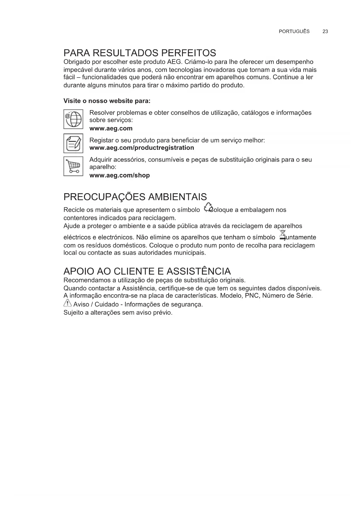 Recomendamos a utilização de peças de substituição originais. Quando contactar a Assistência, certique-se de que tem os seguintes dados disponíveis. A informação encontra-se na placa de características. Modelo, PNC, Número de Série. Aviso / Cuidado - Informações de segurança. Sujeito a alterações sem aviso prévio. PT LIVRO DE INSTRUÇÕES PARA UTILIZAÇÃO.www.aeg.com24