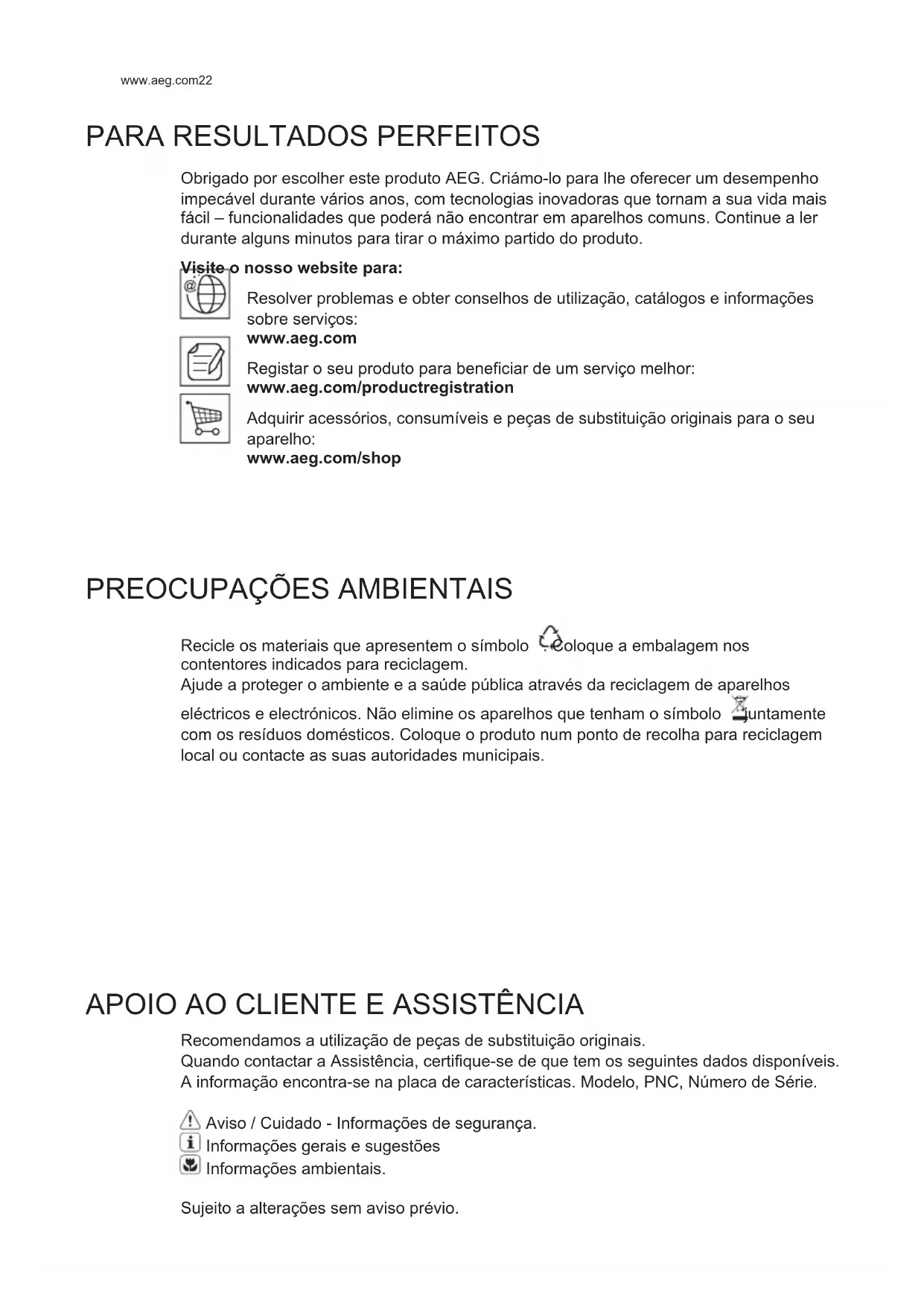 Obrigado por escolher este produto AEG. Criámo-lo para lhe oferecer um desempenho impecável durante vários anos, com tecnologias inovadoras que tornam a sua vida mais fácil – funcionalidades que poderá não encontrar em aparelhos comuns. Continue a ler durante alguns minutos para tirar o máximo partido do produto. Visite o nosso website para: Resolver problemas e obter conselhos de utilização, catálogos e informações sobre serviços: www.aeg.com Registar o seu produto para beneficiar de um serviço melhor: www.aeg.com/productregistration Adquirir acessórios, consumíveis e peças de substituição originais para o seu aparelho: www.aeg.com/shop