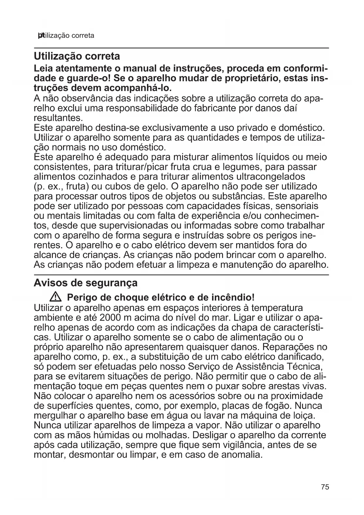 - Utilização correta Utilização correta Leia atentamente o manual de instruções, proceda em conformi- dade e guarde-o! Se o aparelho mudar de proprietário, estas ins- truções devem acompanhá-lo. A não observância das indicações sobre a utilização correta do apa- relho exclui uma responsabilidade do fabricante por danos daí resultantes. Este aparelho destina-se exclusivamente a uso privado e doméstico. Utilizar o aparelho somente para as quantidades e tempos de utiliza- ção normais no uso doméstico. Este aparelho é adequado para misturar alimentos líquidos ou meio consistentes, para triturar/picar fruta crua e legumes, para passar alimentos cozinhados e para triturar alimentos ultracongelados (p. ex., fruta) ou cubos de gelo. O aparelho não pode ser utilizado para processar outros tipos de objetos ou substâncias. Este aparelho pode ser utilizado por pessoas com capacidades físicas, sensoriais ou mentais limitadas ou com falta de experiência e/ou conhecimen- tos, desde que supervisionadas ou informadas sobre como trabalhar com o aparelho de forma segura e instruídas sobre os perigos ine- rentes. O aparelho e o cabo elétrico devem ser mantidos fora do alcance de crianças. As crianças não podem brincar com o aparelho. As crianças não podem efetuar a limpeza e manutenção do aparelho. Avisos de segurança W Perigo de choque elétrico e de incêndio! Utilizar o aparelho apenas em espaços interiores à temperatura ambiente e até 2000 m acima do nível do mar. Ligar e utilizar o apa- relho apenas de acordo com as indicações da chapa de característi- cas. Utilizar o aparelho somente se o cabo de alimentação ou o próprio aparelho não apresentarem quaisquer danos. Reparações no aparelho como, p. ex., a substituição de um cabo elétrico danificado, só podem ser efetuadas pelo nosso Serviço de Assistência Técnica, para se evitarem situações de perigo. Não permitir que o cabo de ali- mentação toque em peças quentes nem o puxar sobre arestas vivas. Não colocar o aparelho nem os acessórios sobre ou na proximidade de superfícies quentes, como, por exemplo, placas de fogão. Nunca mergulhar o aparelho base em água ou lavar na máquina de loiça. Nunca utilizar aparelhos de limpeza a vapor. Não utilizar o aparelho com as mãos húmidas ou molhadas. Desligar o aparelho da corrente após cada utilização, sempre que fique sem vigilância, antes de se montar, desmontar ou limpar, e em caso de anomalia.76 pt Avisos de segurança W Perigo de ferimentos! Vigiar sempre o aparelho durante o funcionamento! Não utilizar o aparelho em vazio. Nunca deixar o aparelho ligado durante mais tempo do que o necessário para a preparação dos alimentos. Ime- diatamente após utilizar o aparelho, aguardar até que o acionamento esteja completamente imobilizado. Depois do aparelho desligado, a lâmina ainda gira durante algum tempo. Antes de se trocar peças acessórias ou opcionais que se movimentam durante o funciona- mento, tem de se desligar o aparelho e retirar a ficha da corrente. Nunca inserir a mão no copo misturador montado. Trabalhar sempre com o misturador completamente montado! Este aparelho só pode ser utilizado com peças e acessórios originais. Não pre- parar alimentos quentes (>50 °C) no copo misturador de plástico. Cuidado ao manusear as lâminas afiadas durante o esvaziamento do recipiente e durante a limpeza. W Perigo de queimaduras! Ao preparar produtos quentes com o copo misturador de vidro, veri- fica-se uma passagem de vapor através da abertura de enchimento para a tampa. Durante o trabalho, segurar na tampa com uma das mãos, sem tocar na abertura de enchimento! Deitar no copo mistu- rador de vidro, no máximo, 0,3 litros de líquido quente ou que desenvolva espuma. W Importante! Os copos misturadores não são adequados para utilização no micro- -ondas. É impreterível limpar cuidadosamente o aparelho após cada utilização ou após um longo período de não utilização, conforme descrito. X “Conservação e limpeza diária” ver página 79 Muitos parabéns por ter comprado um novo aparelho da marca Bosch. Na nossa página da Internet poderá encon- trar mais informações sobre os nossos produtos. Índice Utilização correta p. 75