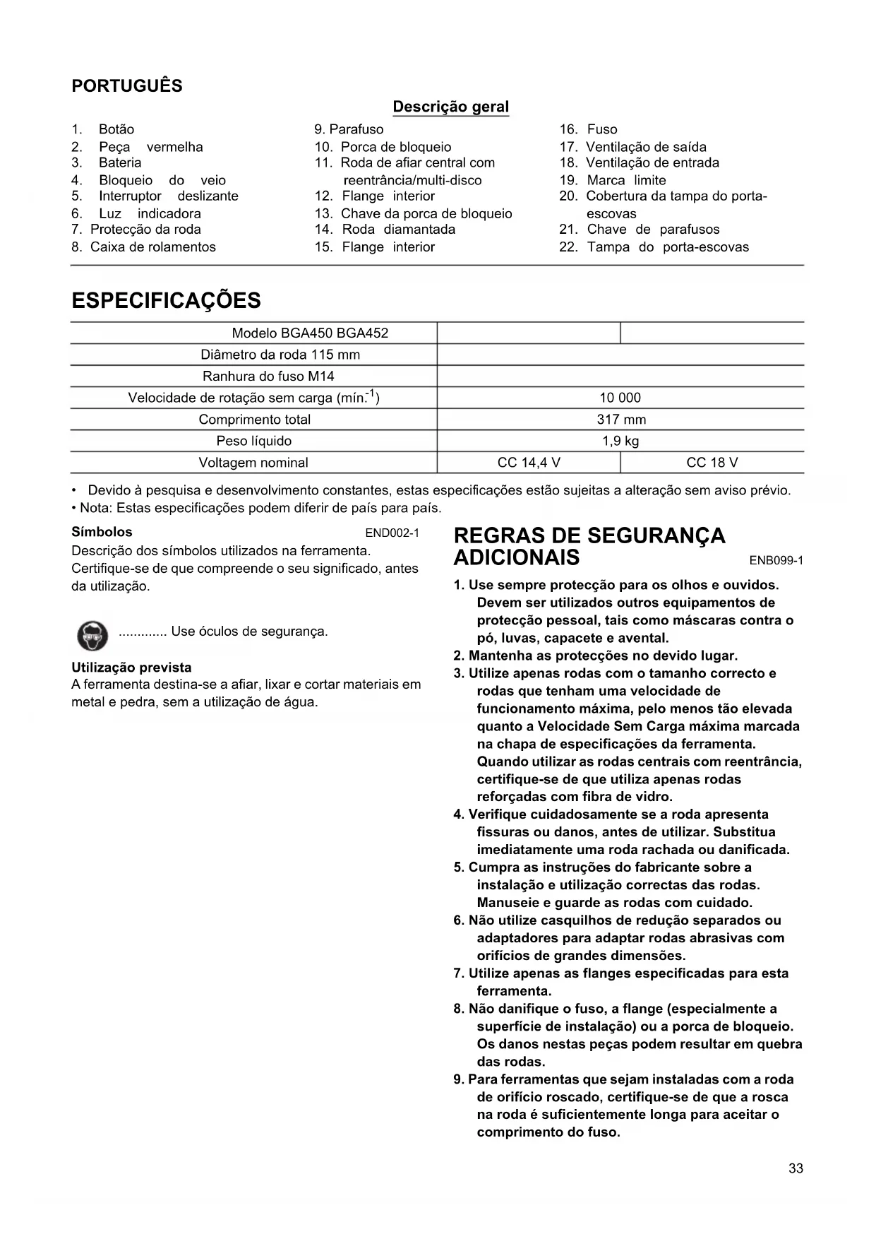 - Nota: Estas especificações podem diferir de país para país. Símbolos END002-1 Descrição dos símbolos utilizados na ferramenta. Certifique-se de que compreende o seu significado, antes da utilização. ............. Use óculos de segurança. Utilização prevista A ferramenta destina-se a afiar, lixar e cortar materiais em metal e pedra, sem a utilização de água.
