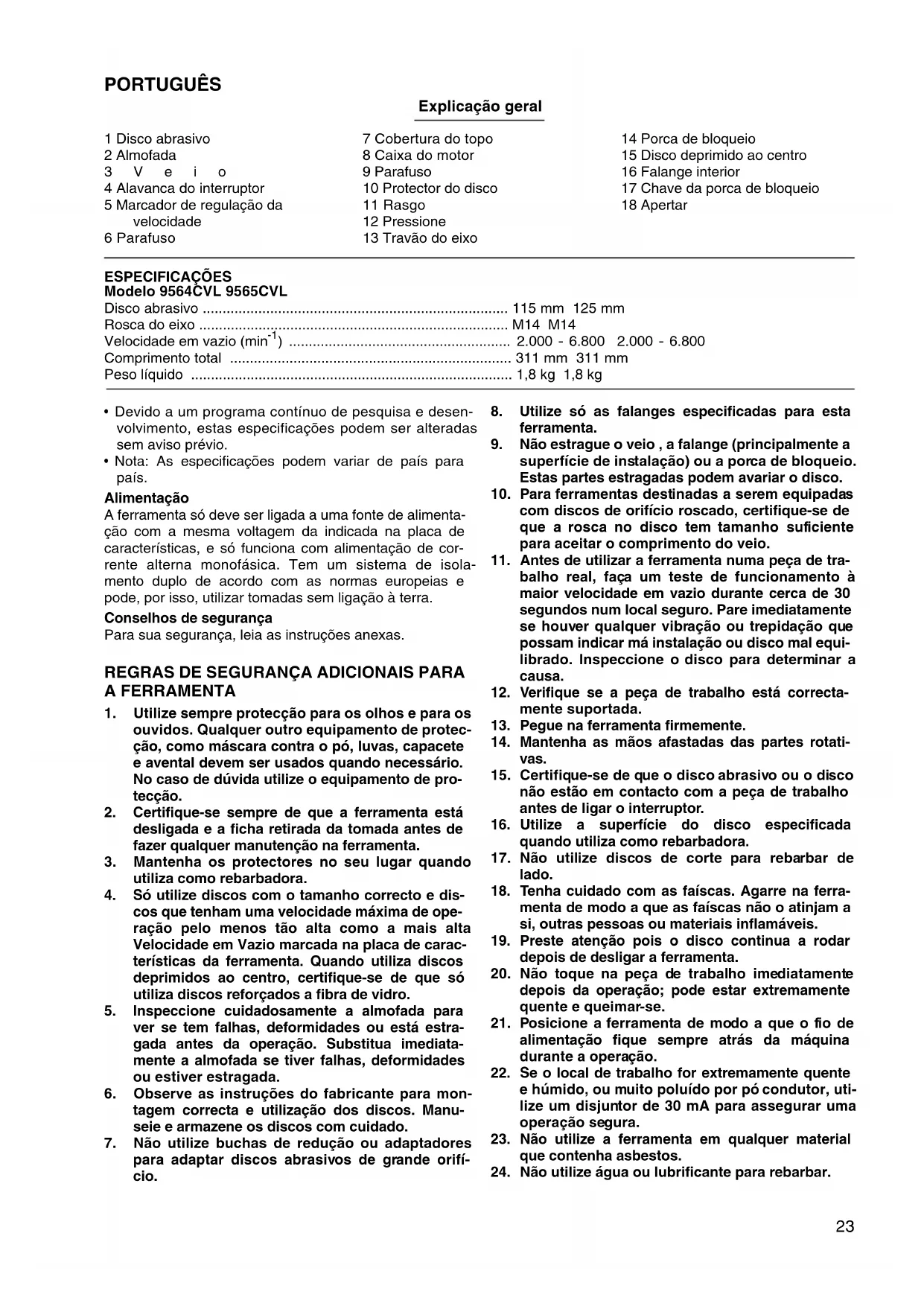 - A utilização contínua de um disco gasto pode originar a fragmentação do mesmo e danos pessoais graves. MANUTENÇÃO PRECAUÇÃO: Certifique-se sempre de que a ferramenta está desligada e a ficha retirada da tomada antes de efectuar qualquer inspecção e manutenção. Reparação e manutenção A ferramenta e as aberturas de ventilação devem estar sempre limpas. Quando matérias estranhas (pó, etc.) entram para esses lugares, devem ser retiradas. Limpe regularmente dependendo da quantidade de pó que foi feito e entrou para dentro da ferramenta. Quando o protector da cabeça está instado na ferra- menta, retire-o referindo-se “Retirar o protector da cabeça”. Para salvaguardar a segurança e a fiabilidade do pro- duto, as reparações, manutenção e afinações deverão ser sempre efectuadas por um Centro de Assistência Oficial MAKITA.26 DANSK Illustrationsoversigt 1 Slibeskive 2 Slibetallerken 3 Spindel 4 Afbryderkontakt 5 Hastighedsvælgerknap 6 Skrue 7 Hovedafskærmning 8Gearhus 9Skrue 10 Beskyttelsesskærm 11 Not 12 Tryk 13 Spindellås 14 Låsemøtrik 15 Forkrøppet midterskive 16 Indvendig flange 17 Nøgle til låsemøtrik 18 Stram SPECIFIKATIONER Model 9564CVL 9565CVL Slibeskive .................................................................................... 115 mm 125 mm Spindelgevind .............................................................................. M14 M14 Omdrejninger (min