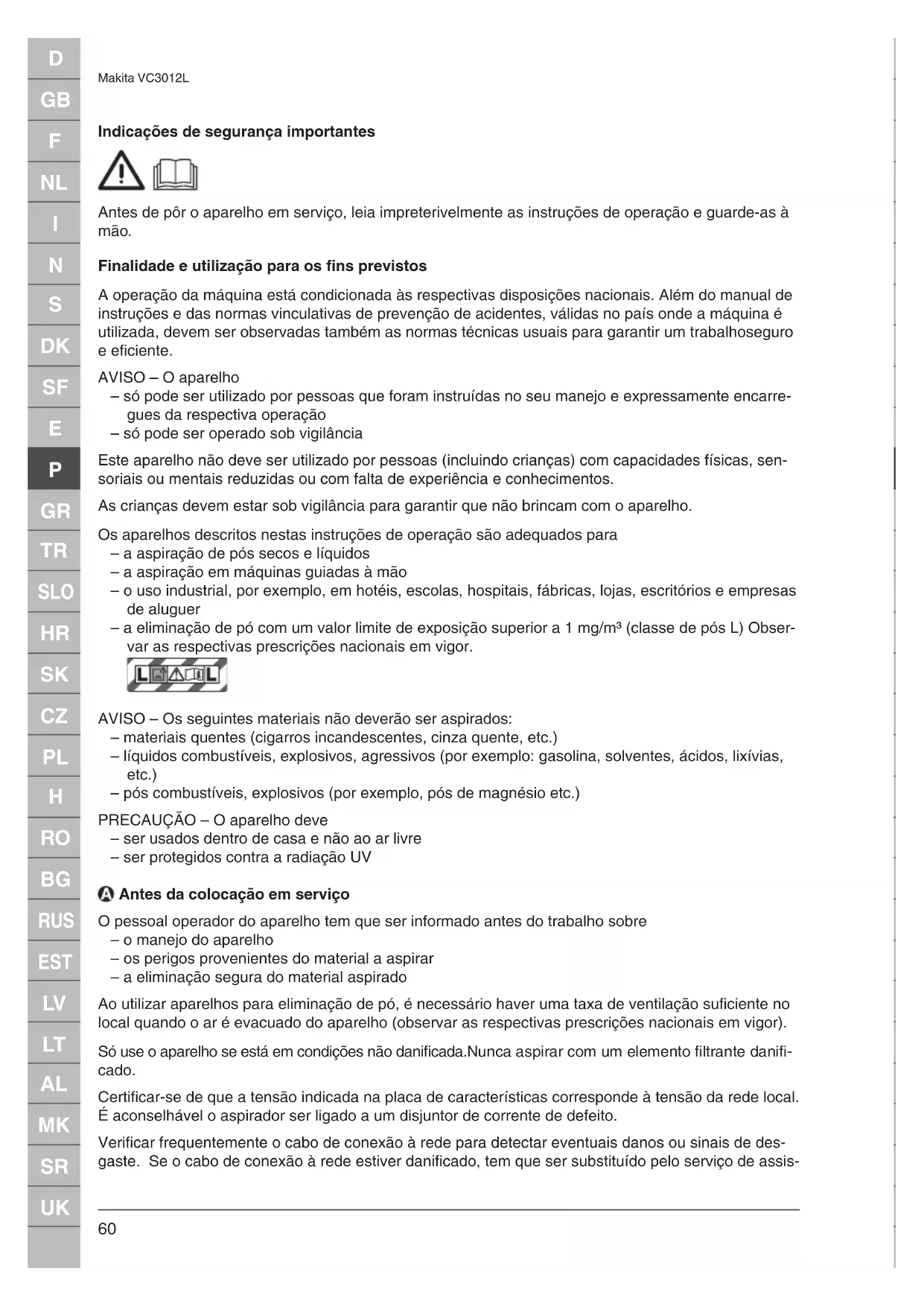 Makita VC3012L Indicações de segurança importantes Antes de pôr o aparelho em serviço, leia impreterivelmente as instruções de operação e guarde-as à mão. Finalidade e utilização para os fins previstos A operação da máquina está condicionada às respectivas disposições nacionais. Além do manual de instruções e das normas vinculativas de prevenção de acidentes, válidas no país onde a máquina é utilizada, devem ser observadas também as normas técnicas usuais para garantir um trabalhoseguro e eficiente. AVISO – O aparelho – só pode ser utilizado por pessoas que foram instruídas no seu manejo e expressamente encarre- gues da respectiva operação – só pode ser operado sob vigilância Este aparelho não deve ser utilizado por pessoas (incluindo crianças) com capacidades físicas, sen- soriais ou mentais reduzidas ou com falta de experiência e conhecimentos. As crianças devem estar sob vigilância para garantir que não brincam com o aparelho. Os aparelhos descritos nestas instruções de operação são adequados para – a aspiração de pós secos e líquidos – a aspiração em máquinas guiadas à mão – o uso industrial, por exemplo, em hotéis, escolas, hospitais, fábricas, lojas, escritórios e empresas de aluguer – a eliminação de pó com um valor limite de exposição superior a 1 mg/m³ (classe de pós L) Obser- var as respectivas prescrições nacionais em vigor. AVISO – Os seguintes materiais não deverão ser aspirados: – materiais quentes (cigarros incandescentes, cinza quente, etc.) – líquidos combustíveis, explosivos, agressivos (por exemplo: gasolina, solventes, ácidos, lixívias, etc.) – pós combustíveis, explosivos (por exemplo, pós de magnésio etc.) PRECAUÇÃO – O aparelho deve – ser usados dentro de casa e não ao ar livre – ser protegidos contra a radiação UV Antes da colocação em serviço O pessoal operador do aparelho tem que ser informado antes do trabalho sobre – o manejo do aparelho – os perigos provenientes do material a aspirar – a eliminação segura do material aspirado Ao utilizar aparelhos para eliminação de pó, é necessário haver uma taxa de ventilação suficiente no local quando o ar é evacuado do aparelho (observar as respectivas prescrições nacionais em vigor). Só use o aparelho se está em condições não danificada.Nunca aspirar com um elemento filtrante danifi- cado. Certificar-se de que a tensão indicada na placa de características corresponde à tensão da rede local. É aconselhável o aspirador ser ligado a um disjuntor de corrente de defeito. Verificar frequentemente o cabo de conexão à rede para detectar eventuais danos ou sinais de des- gaste. Se o cabo de conexão à rede estiver danificado, tem que ser substituído pelo serviço de assis-D
