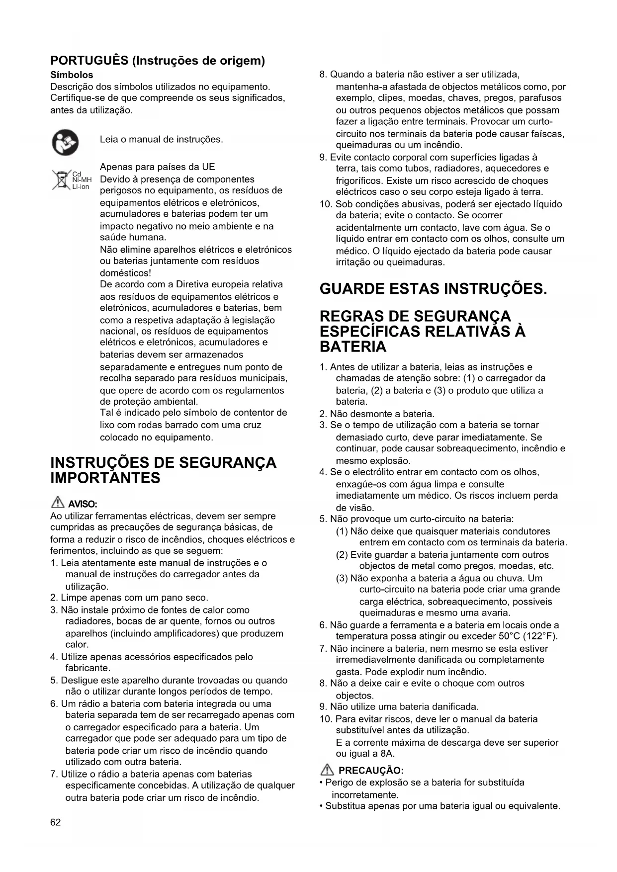 10. Para evitar riscos, deve ler o manual da bateria