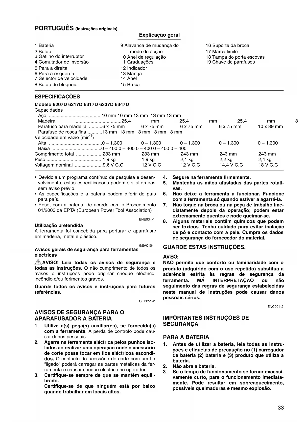 - Tomoyasu Kato Director Makita Corporation 3-11-8, Sumiyoshi-cho, Anjo, Aichi, 446-8502, JAPAN33 PORTUGUÊS (Instruções originais) Explicação geral 1 Bateria 2 Botão 3 Gatilho do interruptor 4 Comutador de inversão 5 Para a direita 6 Para a esquerda 7 Selector de velocidade 8 Botão de bloqueio 9 Alavanca de mudança do modo de acção 10 Anel de regulação 11 Graduações 12 Indicador 13 Manga 14 Anel 15 Broca 16 Suporte da broca 17 Marca limite 18 Tampa do porta escovas 19 Chave de parafusos ESPECIFICAÇÕES Modelo 6207D 6217D 6317D 6337D 6347D Capacidades Aço p. 10