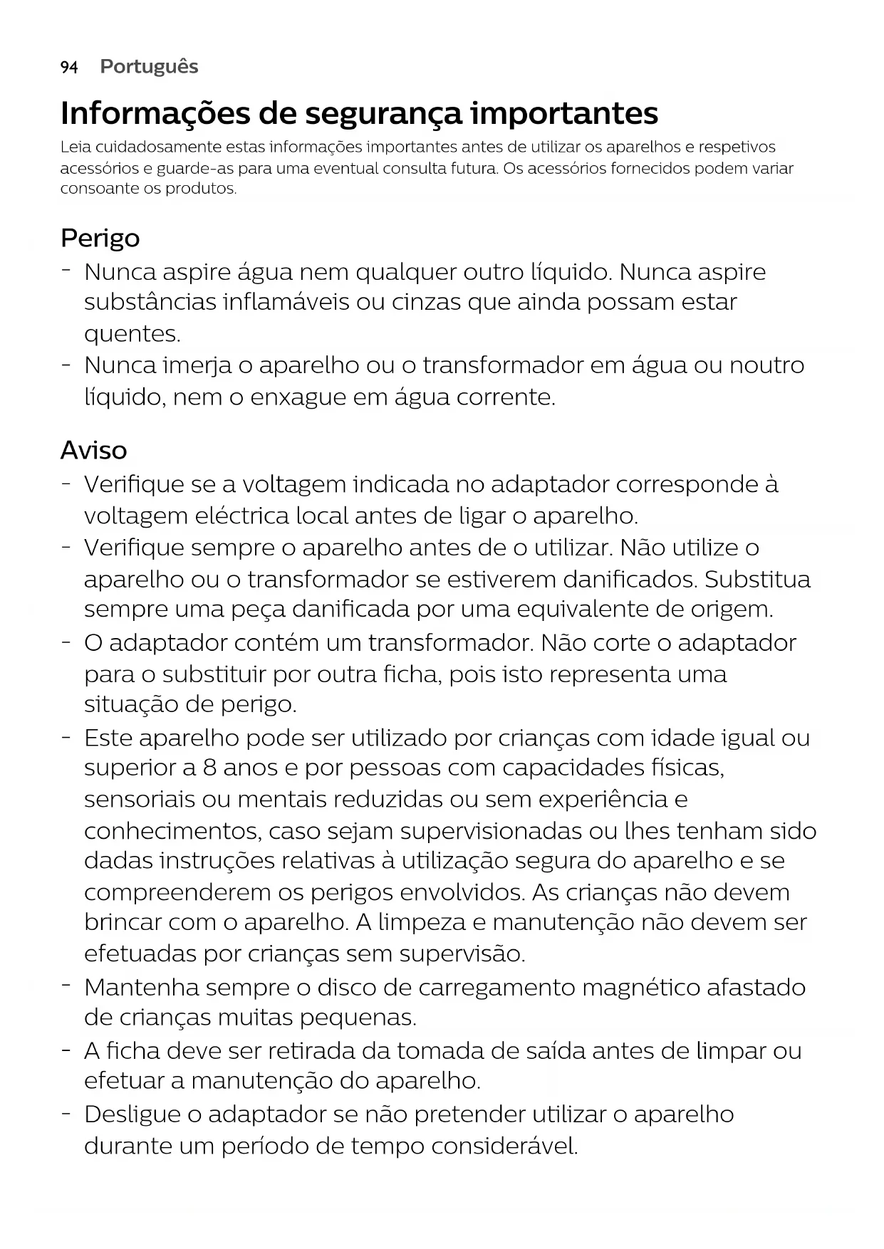 Este aparelho pode ser utilizado por crianças com idade igual ou superior a 8 anos e por pessoas com capacidades físicas, sensoriais ou mentais reduzidas ou sem experiência e conhecimentos, caso sejam supervisionadas ou lhes tenham sido dadas instruções relativas à utilização segura do aparelho e se compreenderem os perigos envolvidos. As crianças não devem brincar com o aparelho. A limpeza e manutenção não devem ser efetuadas por crianças sem supervisão.