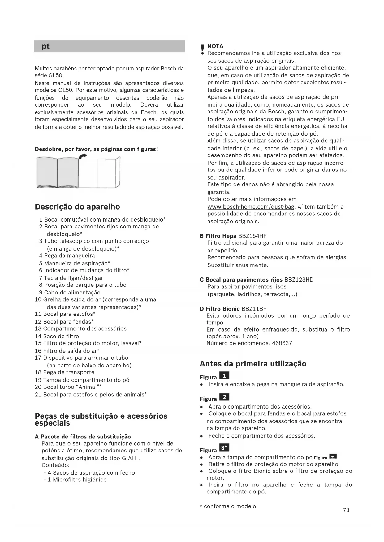 NOTA Recomendamos-lhe a utilização exclusiva dos nos- sos sacos de aspiração originais. O seu aparelho é um aspirador altamente eficiente, que, em caso de utilização de sacos de aspiração de primeira qualidade, permite obter excelentes resul- tados de limpeza. Apenas a utilização de sacos de aspiração de pri- meira qualidade, como, nomeadamente, os sacos de aspiração originais da Bosch, garante o cumprimen- to dos valores indicados na etiqueta energética EU relativos à classe de eficiência energética, à recolha de pó e à capacidade de retenção do pó. Além disso, se utilizar sacos de aspiração de quali- dade inferior (p. ex., sacos de papel), a vida útil e o desempenho do seu aparelho podem ser afetados. Por fim, a utilização de sacos de aspiração incorre- tos ou de qualidade inferior pode originar danos no seu aspirador. Este tipo de danos não é abrangido pela nossa garantia. Pode obter mais informações em www.bosch-home.com/dust-bag . Aí tem também a possibilidade de encomendar os nossos sacos de aspiração originais. B Filtro Hepa BBZ154HF Filtro adicional para garantir uma maior pureza do ar expelido. Recomendado para pessoas que sofram de alergias. Substituir anualmente. C Bocal para pavimentos rijos BBZ123HD Para aspirar pavimentos lisos (parquete, ladrilhos, terracota,...) D Filtro Bionic BBZ11BF Evita odores incómodos por um longo período de tempo Em caso de efeito enfraquecido, substitua o filtro (após aprox. 1 ano) Número de encomenda: 468637 Antes da primeira utilização Figura ● Insira e encaixe a pega na mangueira de aspiração. Figura ● Abra o compartimento dos acessórios. ● Coloque o bocal para fendas e o bocal para estofos no compartimento dos acessórios que se encontra na tampa do aparelho. ● Feche o compartimento dos acessórios. Figura ● Abra a tampa do compartimento do pó. Figura ● Retire o filtro de proteção do motor do aparelho. ● Coloque o filtro Bionic sobre o filtro de proteção do motor. ● Insira o filtro no aparelho e feche a tampa do compartimento do pó.