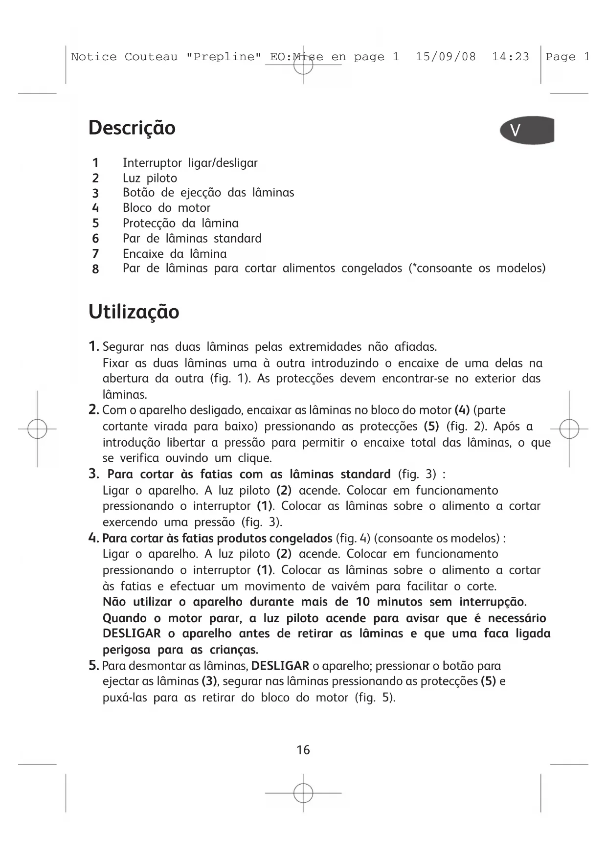 - Desligar o aparelho e retirar a ficha da tomada antes de proceder à substituição das lâminas ou de aproximar as partes que se movem durante o funcionamento. Notice Couteau "Prepline" EO:Mise en page 1 15/09/08 14:23 Page 1718 Em todos estes casos ou para qualquer reparação É NECESSÁRIO que se dirija a um Serviço de Assistência Técnica autorizado. O seu aparelho foi concebido apenas para uso doméstico. Qualquer utilização profissional anula a garantia e liberta o fabricante de qualquer responsabilidade. Produto eléctrico ou electrónico em fim de vida Protecção do meio ambiente em primeiro lugar! O seu aparelho contém materiais que podem ser recuperados ou reciclados. Entregue-o num ponto de recolha para possibilitar o seu tratamento. Notice Couteau "Prepline" EO:Mise en page 1 15/09/08 14:23 Page 1819 Descrizione