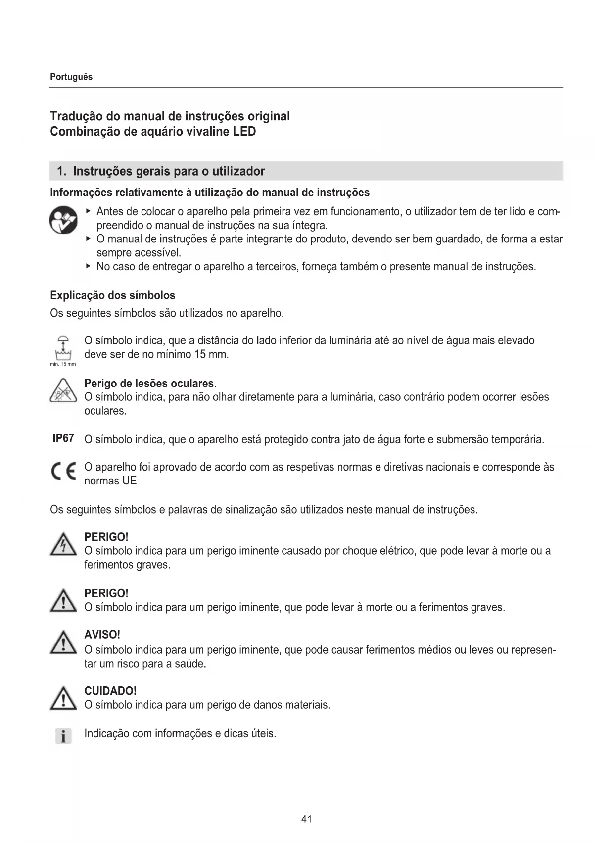 preendido o manual de instruções na sua íntegra. ▶ O manual de instruções é parte integrante do produto, devendo ser bem guardado, de forma a estar sempre acessível. ▶ No caso de entregar o aparelho a terceiros, forneça também o presente manual de instruções. Explicação dos símbolos Os seguintes símbolos são utilizados no aparelho. O símbolo indica, que a distância do lado inferior da luminária até ao nível de água mais elevado deve ser de no mínimo 15 mm. Perigo de lesões oculares. O símbolo indica, para não olhar diretamente para a luminária, caso contrário podem ocorrer lesões oculares. O símbolo indica, que o aparelho está protegido contra jato de água forte e submersão temporária. O aparelho foi aprovado de acordo com as respetivas normas e diretivas nacionais e corresponde às normas UE Os seguintes símbolos e palavras de sinalização são utilizados neste manual de instruções. PERIGO! O símbolo indica para um perigo iminente causado por choque elétrico, que pode levar à morte ou a ferimentos graves. PERIGO! O símbolo indica para um perigo iminente, que pode levar à morte ou a ferimentos graves. AVISO! O símbolo indica para um perigo iminente, que pode causar ferimentos médios ou leves ou represen- tar um risco para a saúde. CUIDADO! O símbolo indica para um perigo de danos materiais. Indicação com informações e dicas úteis.