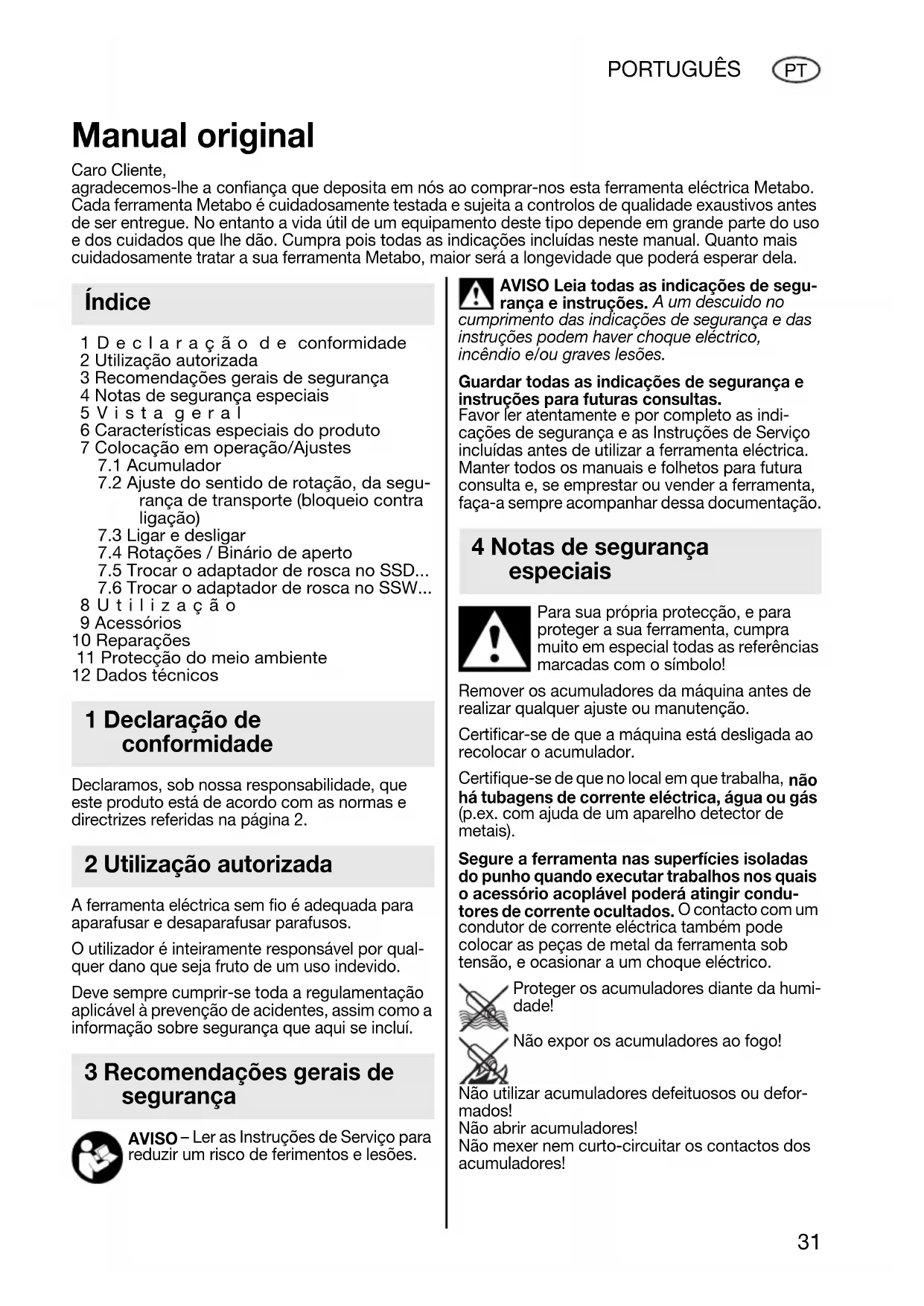 8Utilização 9 Acessórios 10 Reparações 11 Protecção do meio ambiente 12 Dados técnicos Declaramos, sob nossa responsabilidade, que este produto está de acordo com as normas e directrizes referidas na página 2. A ferramenta eléctrica sem fio é adequada para aparafusar e desaparafusar parafusos. O utilizador é inteiramente responsável por qual- quer dano que seja fruto de um uso indevido. Deve sempre cumprir-se toda a regulamentação aplicável à prevenção de acidentes, assim como a informação sobre segurança que aqui se incluí. AVISO – Ler as Instruções de Serviço para reduzir um risco de ferimentos e lesões. AVISO Leia todas as indicações de segu- rança e instruções. A um descuido no cumprimento das indicações de segurança e das instruções podem haver choque eléctrico, incêndio e/ou graves lesões. Guardar todas as indicações de segurança e instruções para futuras consultas. Favor ler atentamente e por completo as indi- cações de segurança e as Instruções de Serviço incluídas antes de utilizar a ferramenta eléctrica. Manter todos os manuais e folhetos para futura consulta e, se emprestar ou vender a ferramenta, faça-a sempre acompanhar dessa documentação. Para sua própria protecção, e para proteger a sua ferramenta, cumpra muito em especial todas as referências marcadas com o símbolo! Remover os acumuladores da máquina antes de realizar qualquer ajuste ou manutenção. Certificar-se de que a máquina está desligada ao recolocar o acumulador. Certifique-se de que no local em que trabalha, não há tubagens de corrente eléctrica, água ou gás (p.ex. com ajuda de um aparelho detector de metais). Segure a ferramenta nas superfícies isoladas do punho quando executar trabalhos nos quais o acessório acoplável poderá atingir condu- tores de corrente ocultados. O contacto com um condutor de corrente eléctrica também pode colocar as peças de metal da ferramenta sob tensão, e ocasionar a um choque eléctrico. Proteger os acumuladores diante da humi- dade! Não expor os acumuladores ao fogo! Não utilizar acumuladores defeituosos ou defor- mados! Não abrir acumuladores! Não mexer nem curto-circuitar os contactos dos acumuladores! Manual original Caro Cliente, agradecemos-lhe a confiança que deposita em nós ao comprar-nos esta ferramenta eléctrica Metabo. Cada ferramenta Metabo é cuidadosamente testada e sujeita a controlos de qualidade exaustivos antes de ser entregue. No entanto a vida útil de um equipamento deste tipo depende em grande parte do uso e dos cuidados que lhe dão. Cumpra pois todas as indicações incluídas neste manual. Quanto mais cuidadosamente tratar a sua ferramenta Metabo, maior será a longevidade que poderá esperar dela. Índice 1 Declaração de conformidade 2 Utilização autorizada 3 Recomendações gerais de segurança 4 Notas de segurança especiais 17026933_0311 SSW SSD 14_4 18.book Seite 31 Mittwoch, 9. März 2011 1:55 1332 PORTUGUÊS