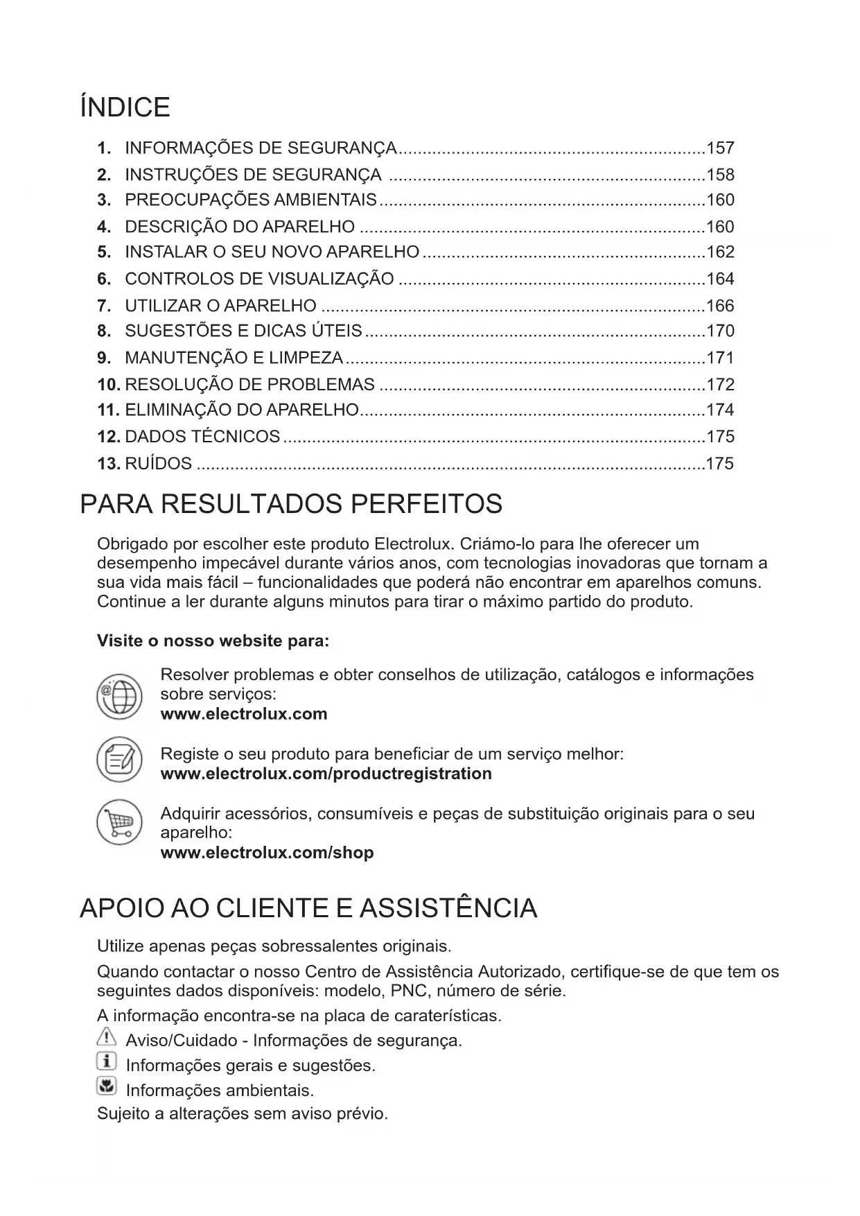 Existem alguns ruídos durante o funcio- namento normal (compressor, circulação do refrigerante).176 www.electrolux.com177 PORTUGUÊSCUPRINS