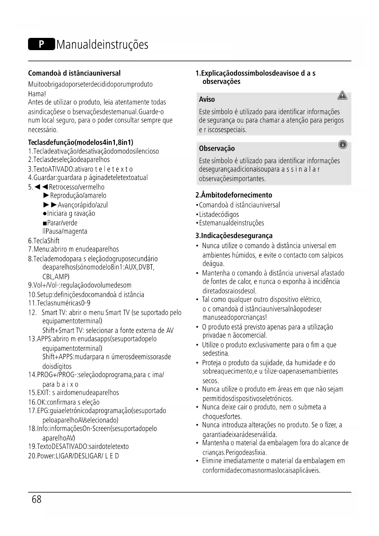 Observação sobreaproteção ambiental: Após atransposição das Diretivas Comunitárias 2012/19/EU e2006/66/ CE paraalegislação nacional, aplica-se o seguinte: Os dispositivos eequipamentos elétricos eeletrónicos, bem como as pilhas ebaterias, não podem ser eliminados juntamente com olixo doméstico. Os consumidores estão obrigados por lei adepositar os dispositivo eequipamentos elétricos eeletrónicos, bem como as pilhas easbaterias, no m das respetivas vidas úteis, em locais públicos especícos paraeste efeito ou aentregá-los no ponto de venda. Os detalhes deste processo estão estipulados nas leis dos respetivos países. Este símbolo no produto, no manual de instruções ou na embalagem indica que oproduto está sujeito aestes regulamentos. Ao possibilitar a reciclagem eareutilização dos materiais dos seus aparelhos/baterias velhos, está afazer uma enorme contribuição paraaproteção do ambiente.74 S Bruksanvisning Universalfjärrkontroll Tack för att du valt att köpa en Hamaprodukt. Ta dig tid och läs först igenom de följande anvisningarna och informationen fullständigt. Förvarasedan den här bruksanvisningen på en säker plats för att kunna titta i den vid ett senaretillfälle. Funktionsknappar (modell 4in1, 8in1)